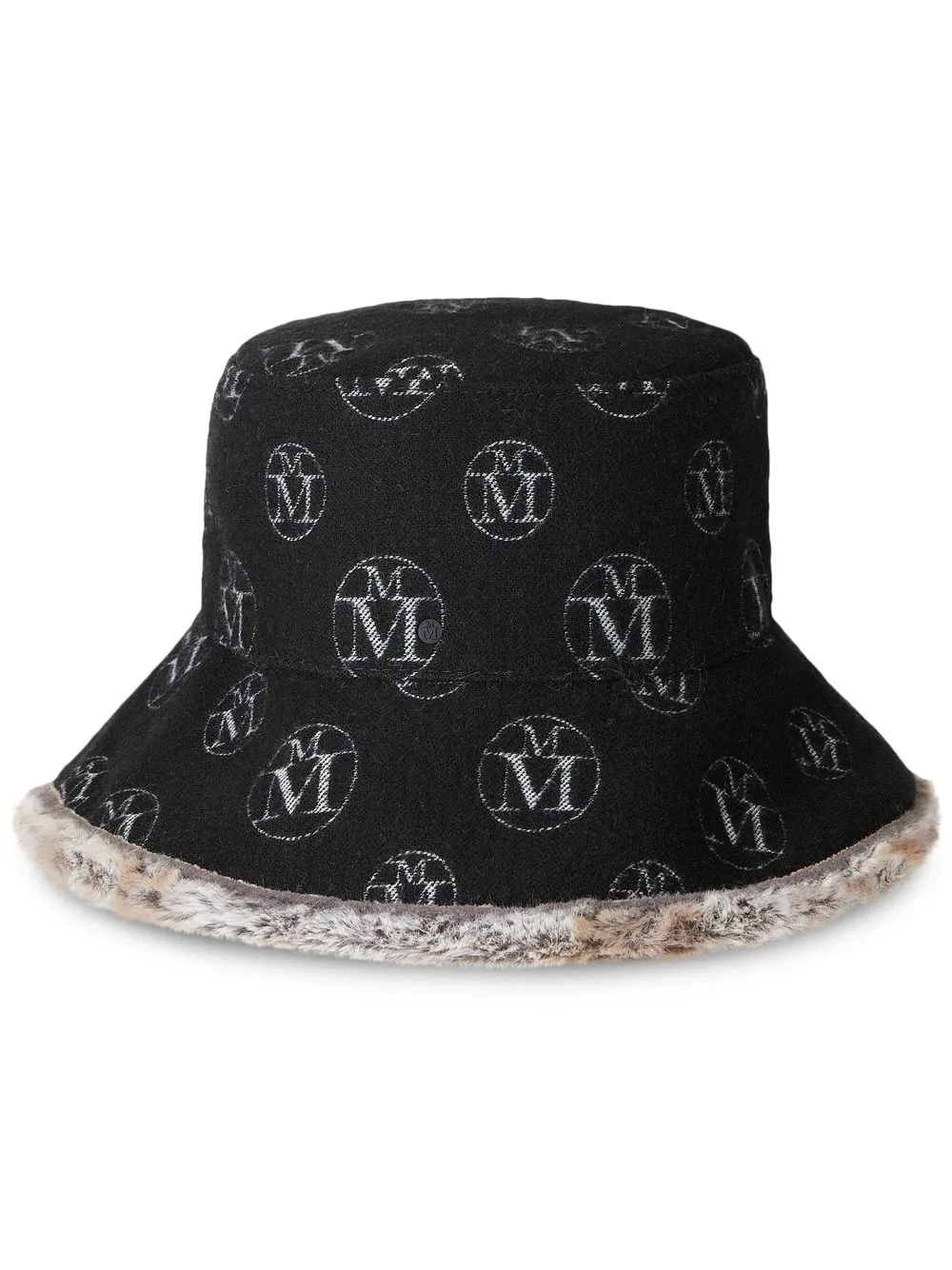 Negro, lana, ribete de pelo artificial, ala ancha y monograma en jacquard.