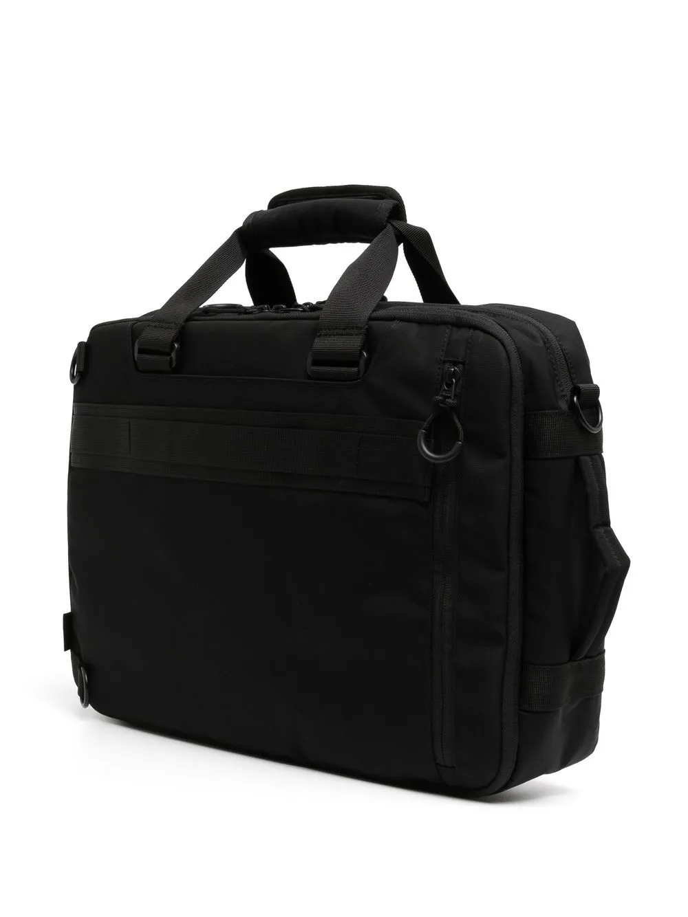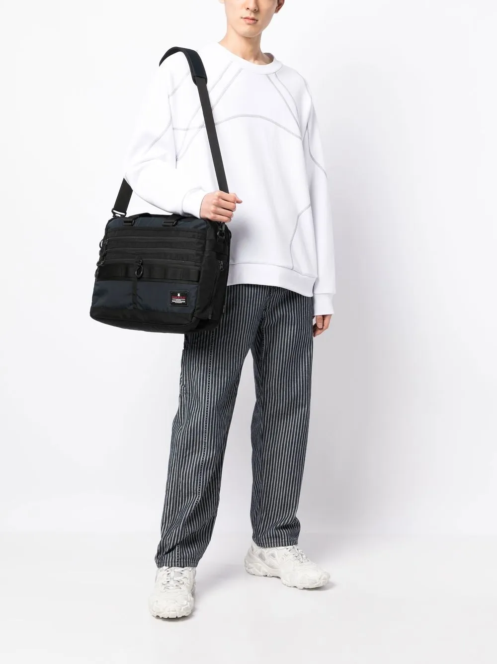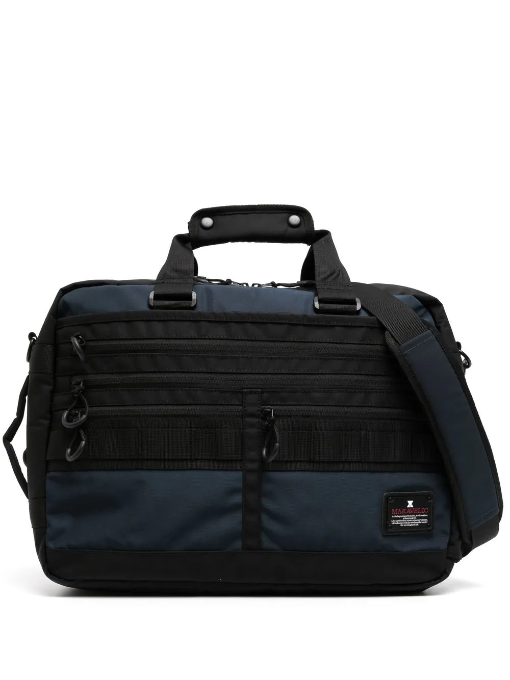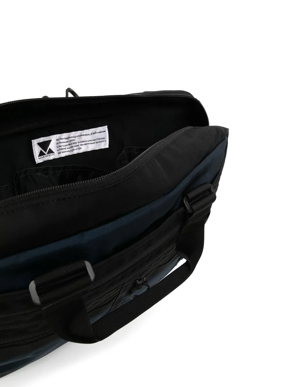 Negro y azul, parche del logo en la parte delantera, múltiples bolsillos con cremallera, cierre con cremallera en el tope, compartimento principal, dos asas en la parte superior y correa ajustable y removible para el hombro.