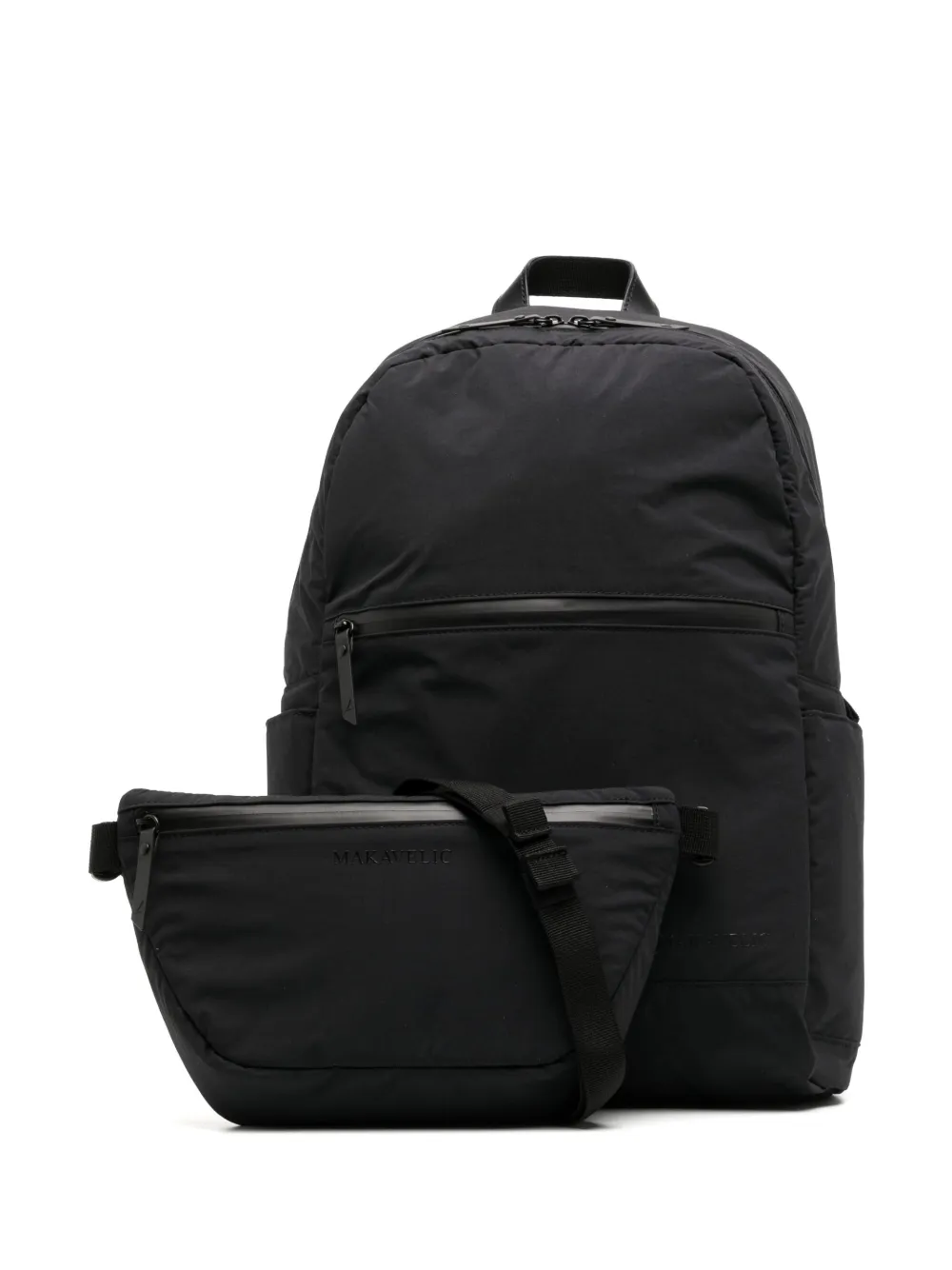 Logo grabado en el lateral, cierre con cremallera en el tope, asa circular en la parte superior, dos correas acolchadas ajustables para los hombros, bolsillo de parche en el lateral, bolsillo con cremallera en la parte delantera, compartimento principal y parche del logo en el interior.