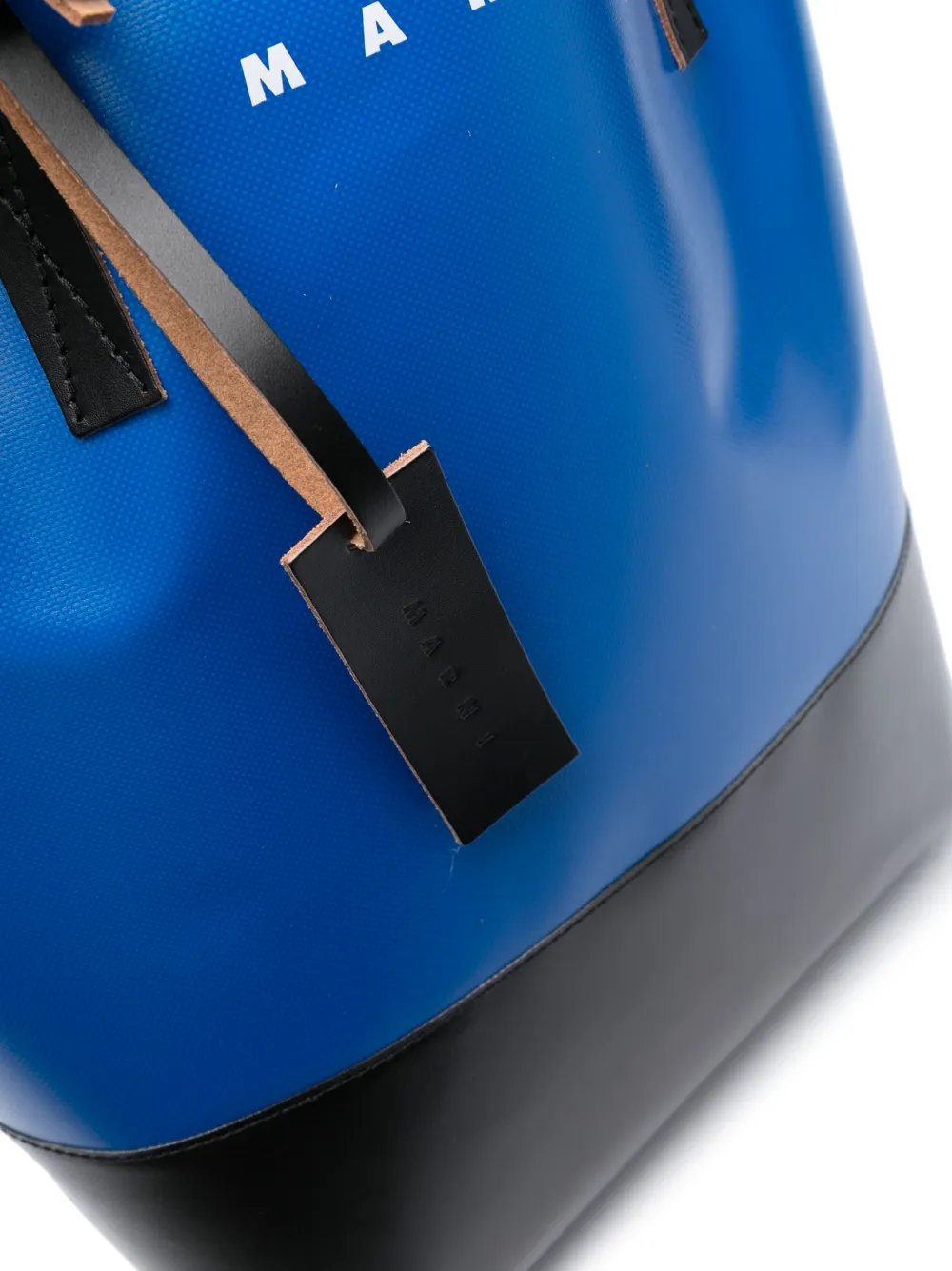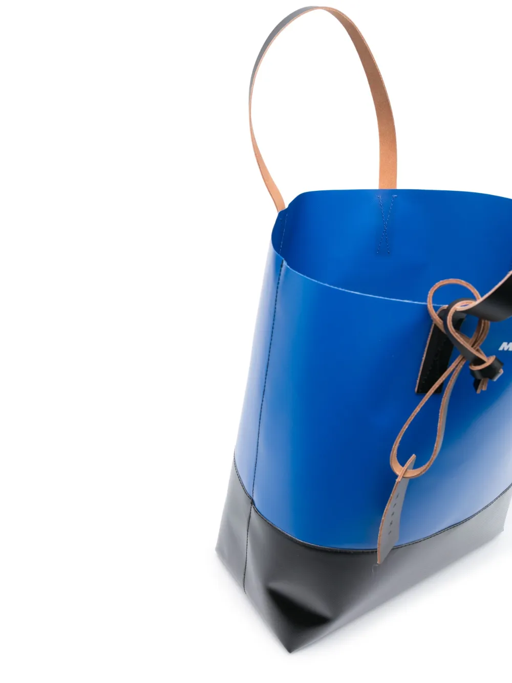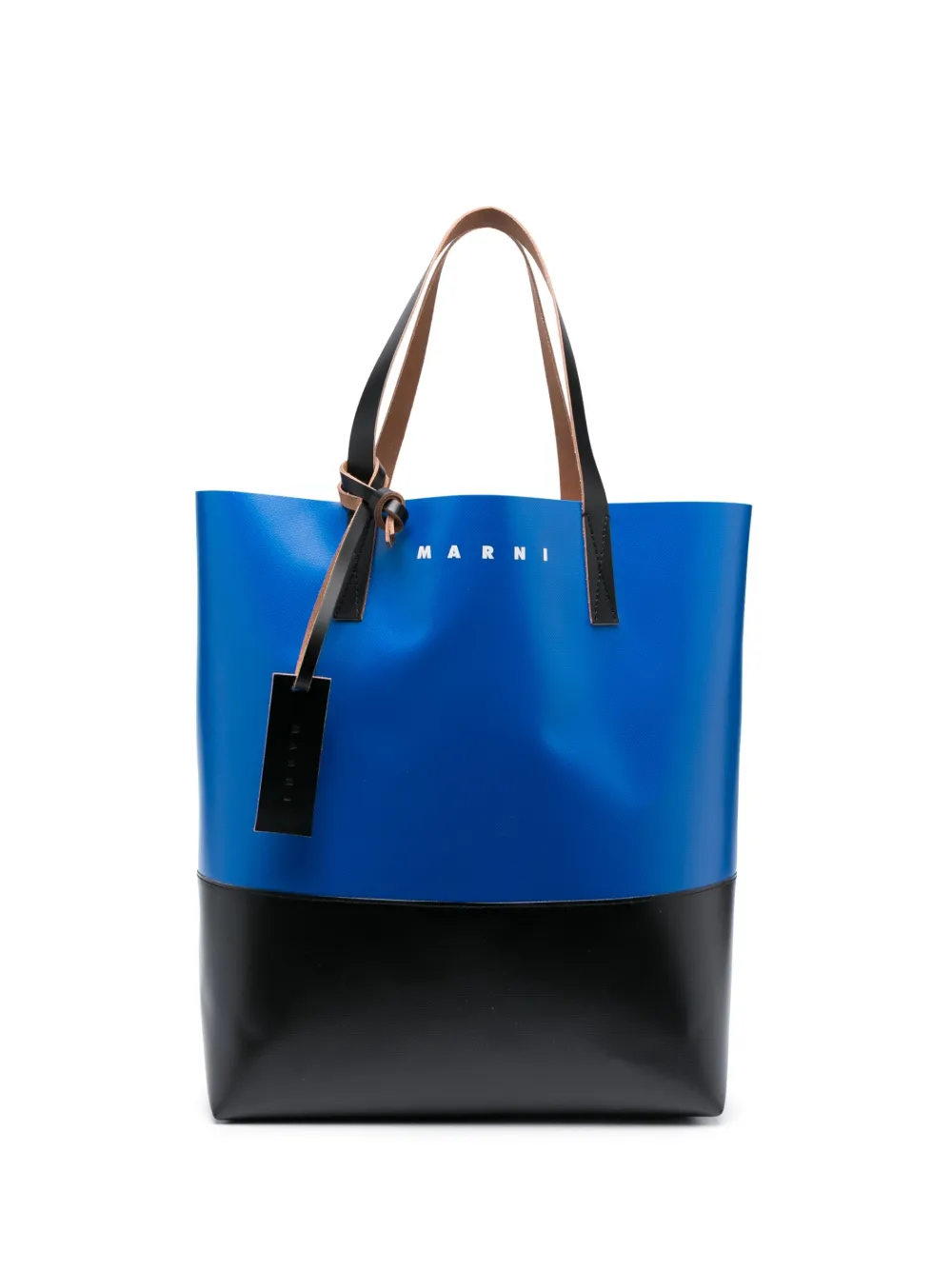 Azul real, negro, piel de becerro, piel artificial, tejido piqué, diseño colour block, logo con letras plateadas, parche con logo grabado en la parte posterior, costuras del mismo tono, abierto en el tope, dos asas largas en la parte superior y compartimento principal.