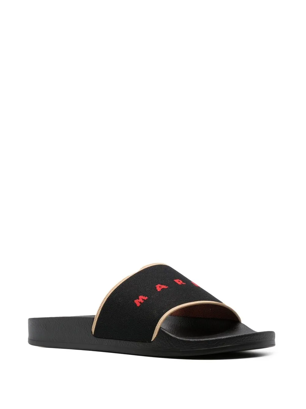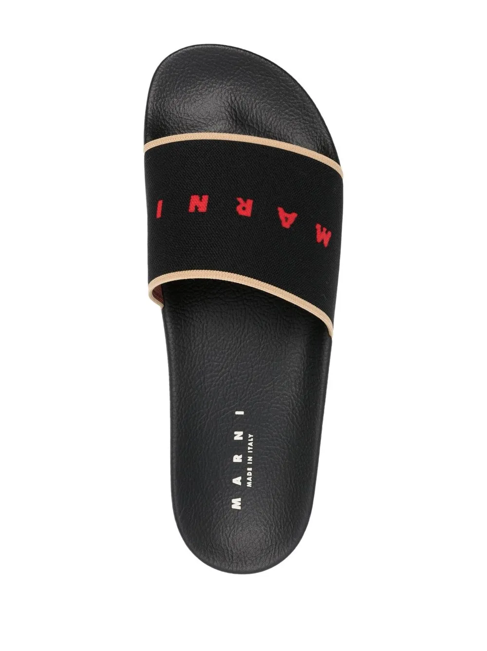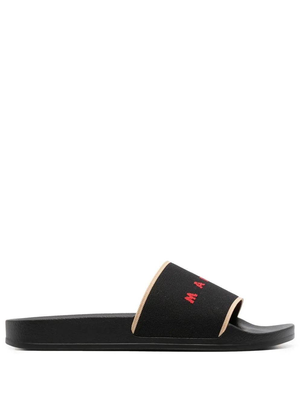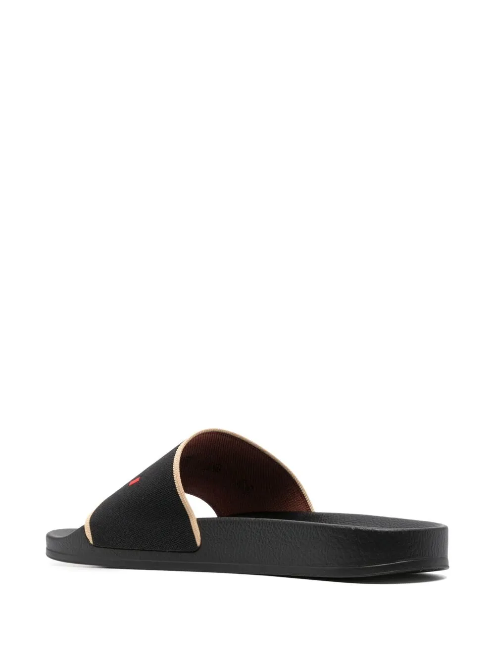 Estampado del logo en la parte delantera, puntera abierta, plantilla con logo y suela plana de goma.