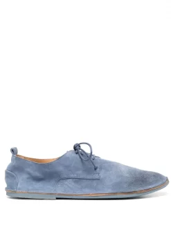 Azul, ante de becerro, puntera redonda, cierre con cordones en la parte delantera y suela plana de cuero.