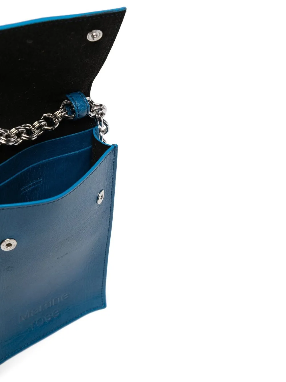 Forma rectangular, compartimentos para tarjetas en la parte posterior y parte superior plegable con botón de presión.