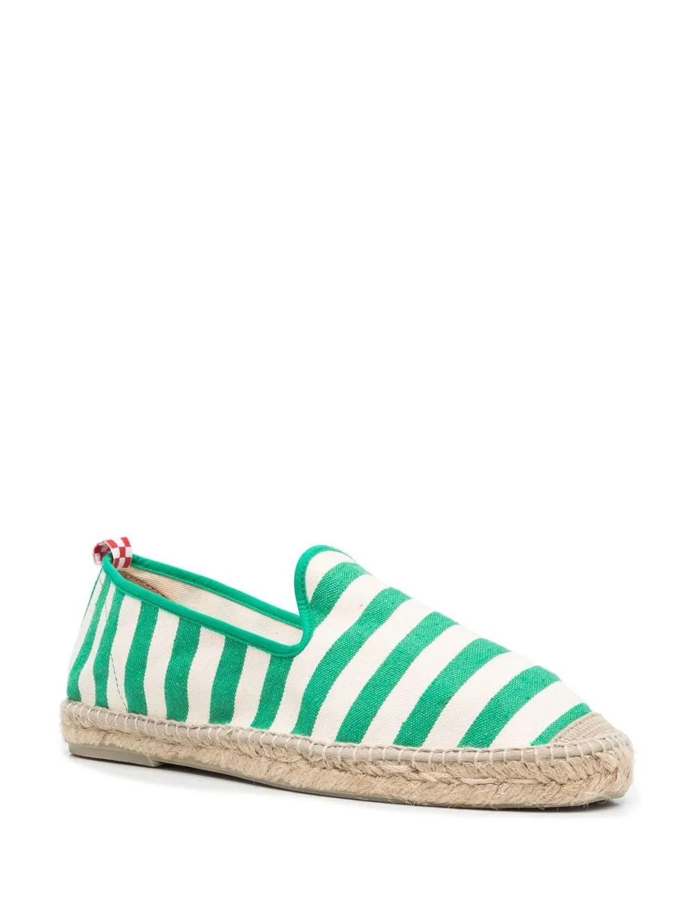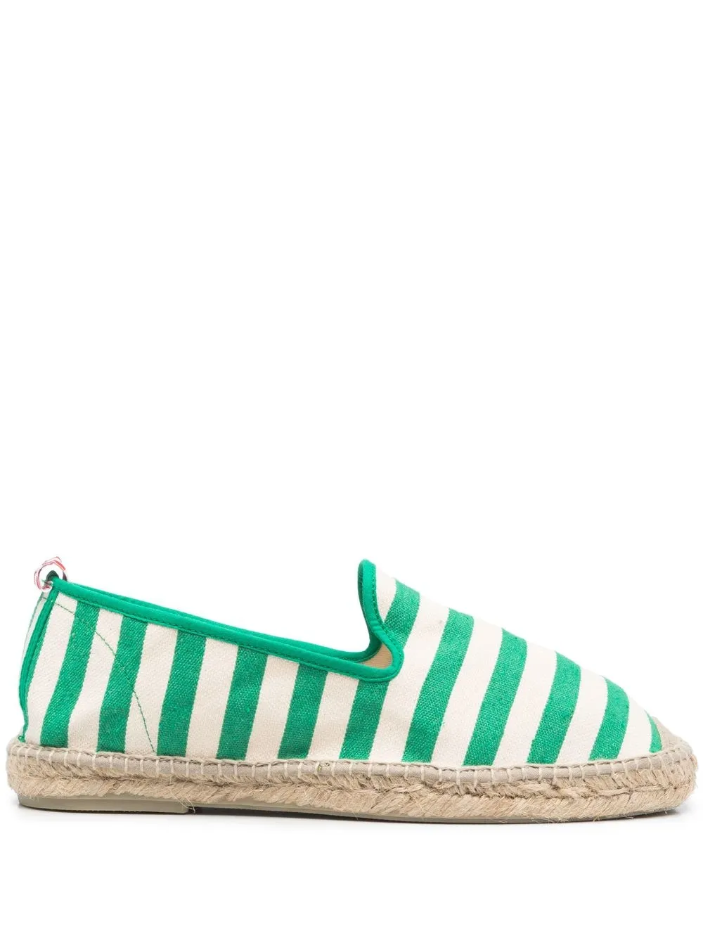 Verde brillante, blanco, yute, estampado a rayas, puntera redonda y suela plana.