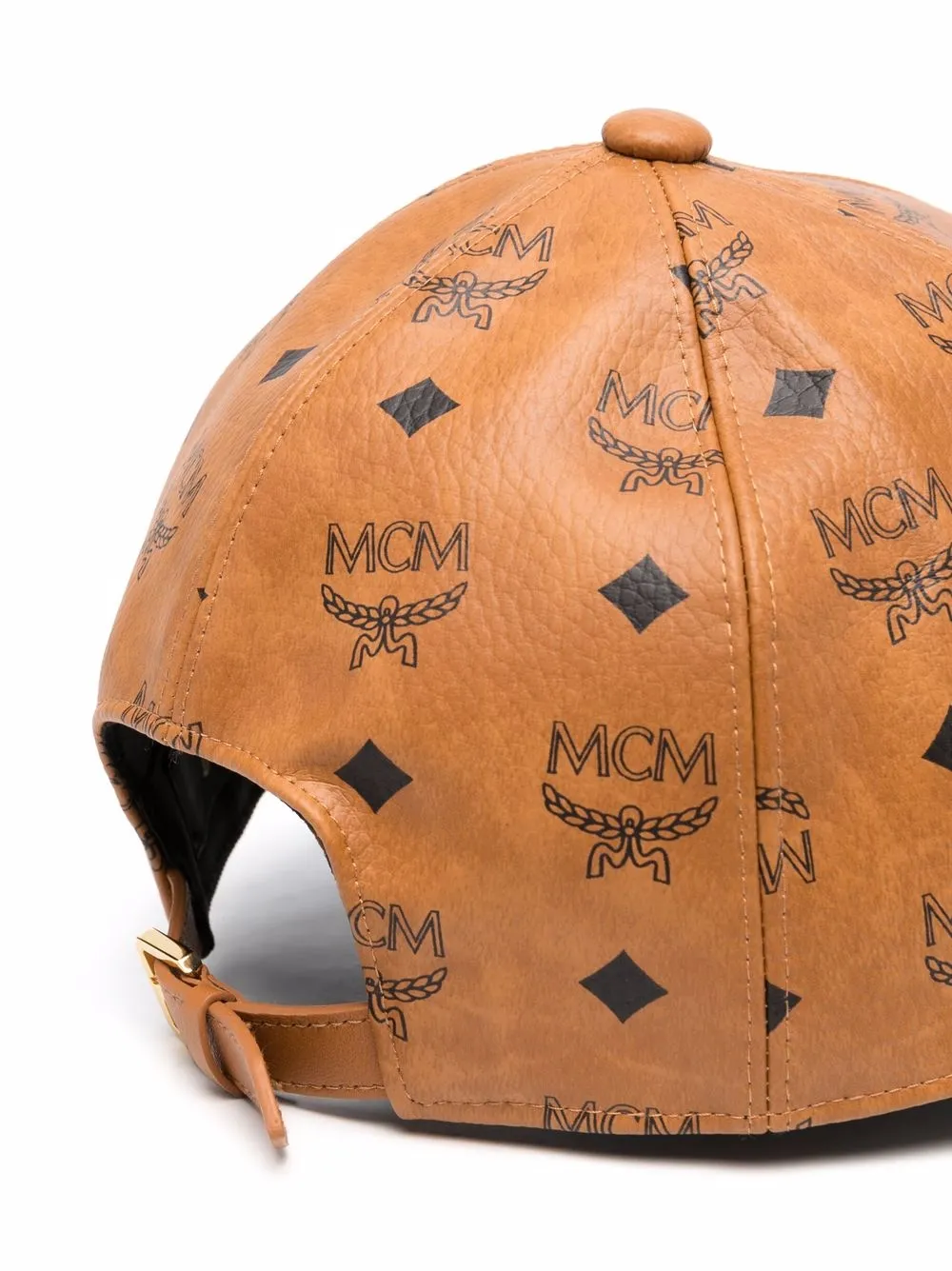 Textura granulada, estampado del logo en toda la pieza, acabado en tono dorado, visera curva y correa ajustable en la parte posterior.