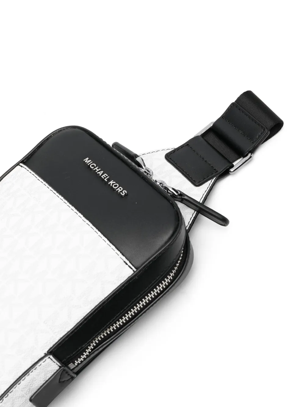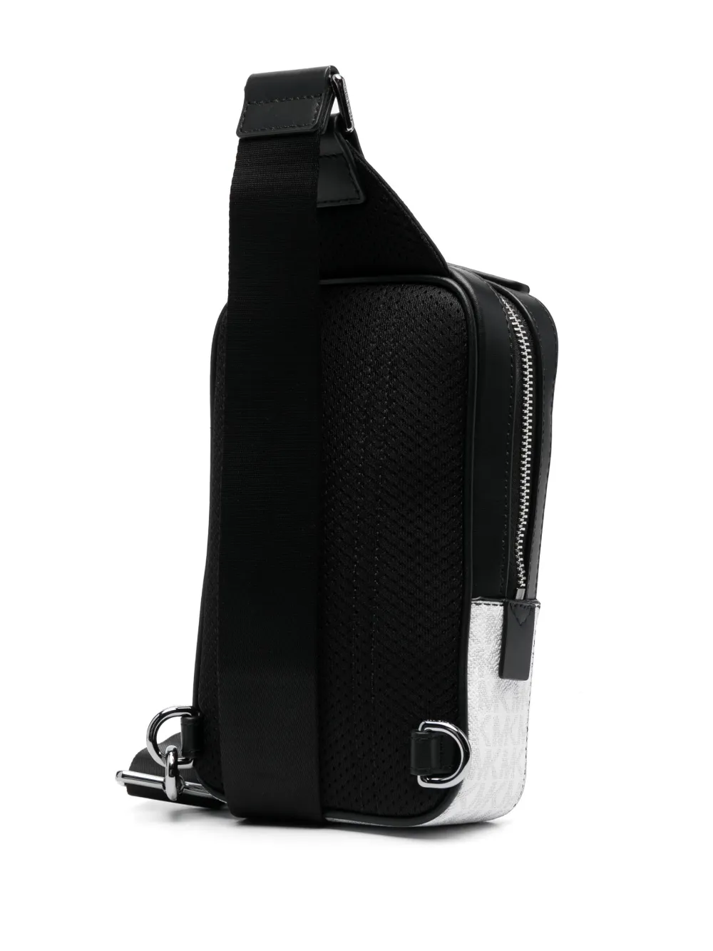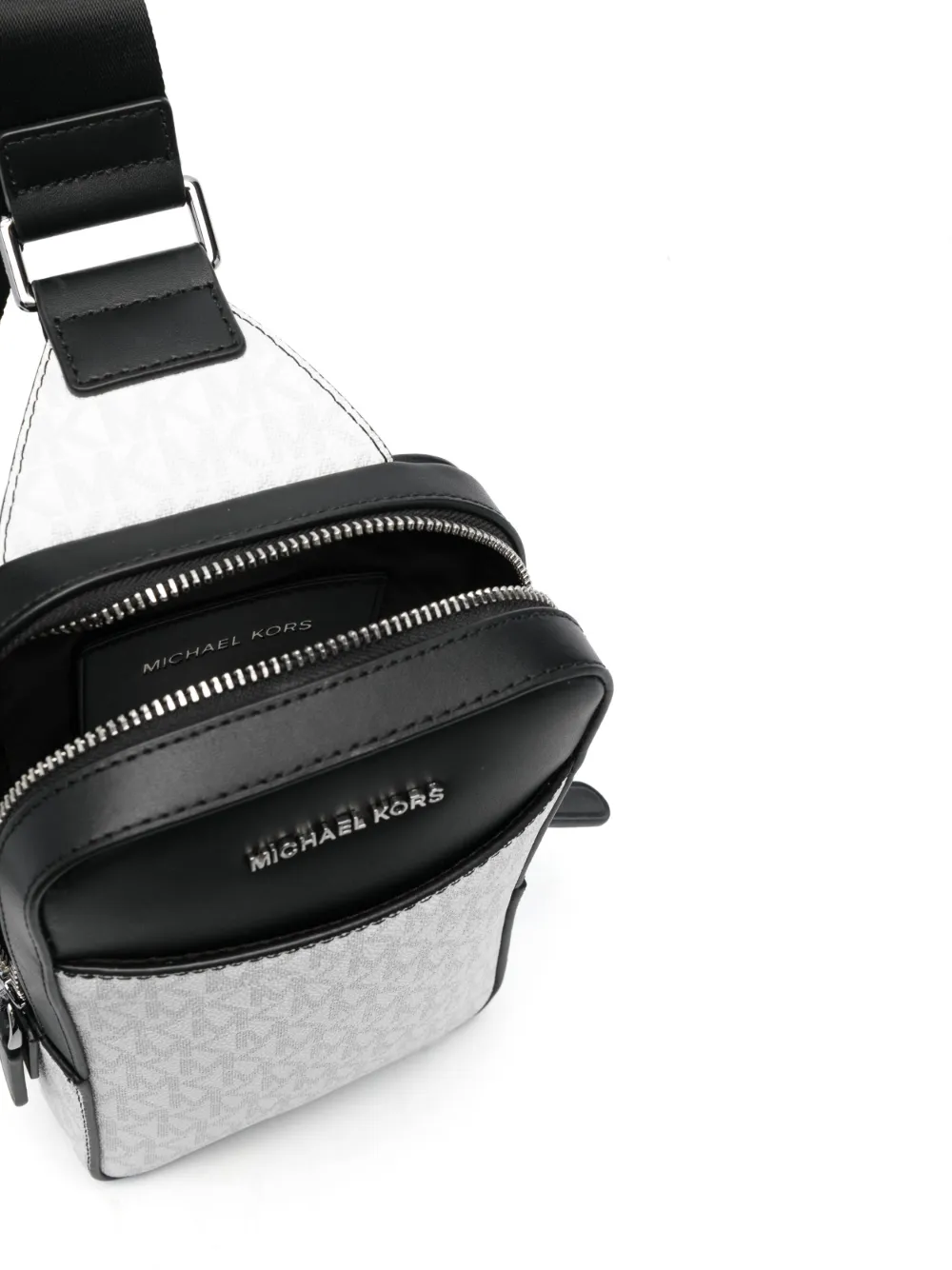Piel artificial, textura granulada, motivo de monograma, logo con letras plateadas, sello del logo en el interior, correa de hombro ajustable, cierre con cremallera en el tope y bolsillo en la parte delantera.