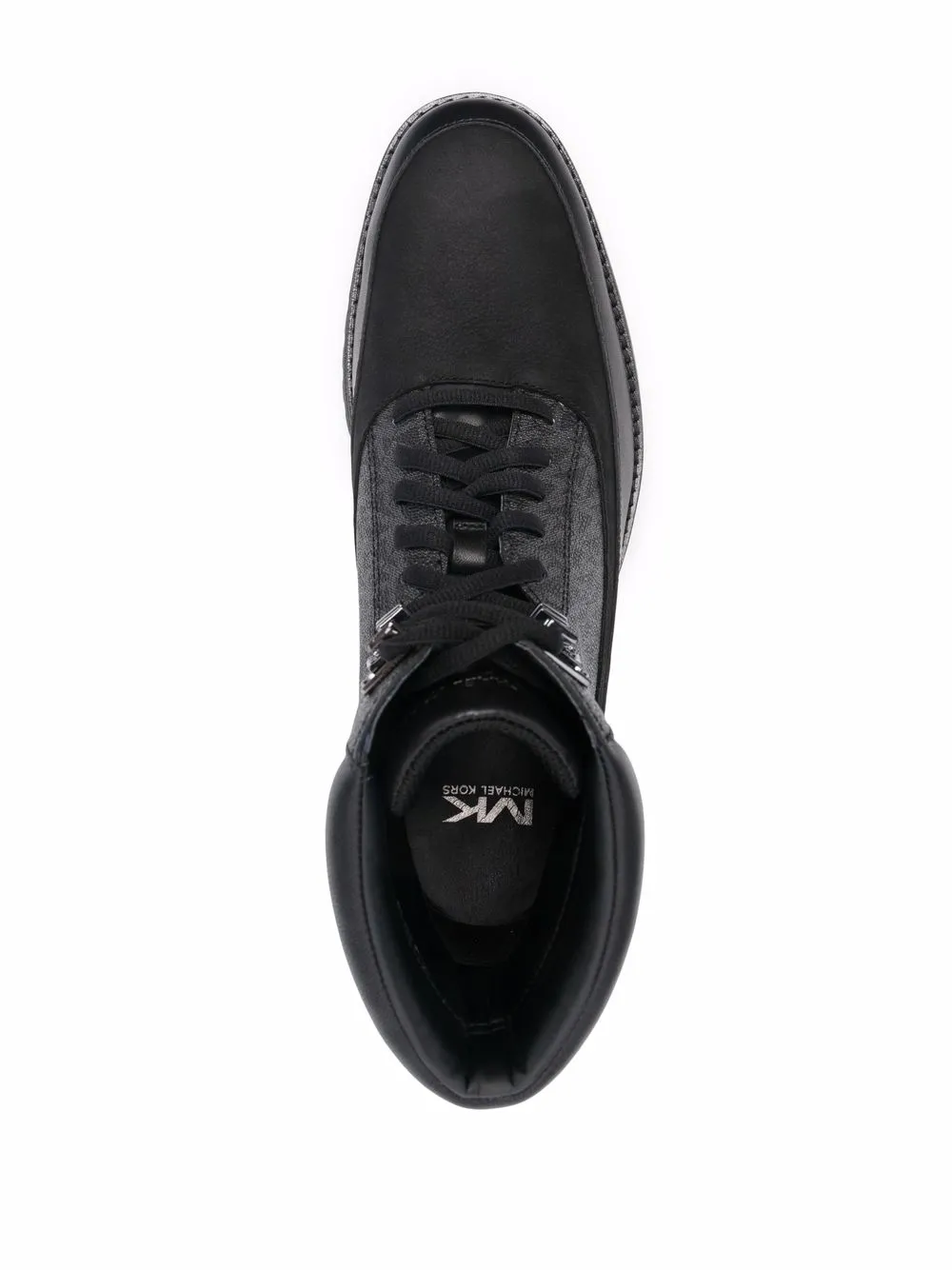 Motivo de monograma, diseño de paneles, suela plana de goma, cierre con cordones en la parte delantera y puntera redonda. Material: cuero.