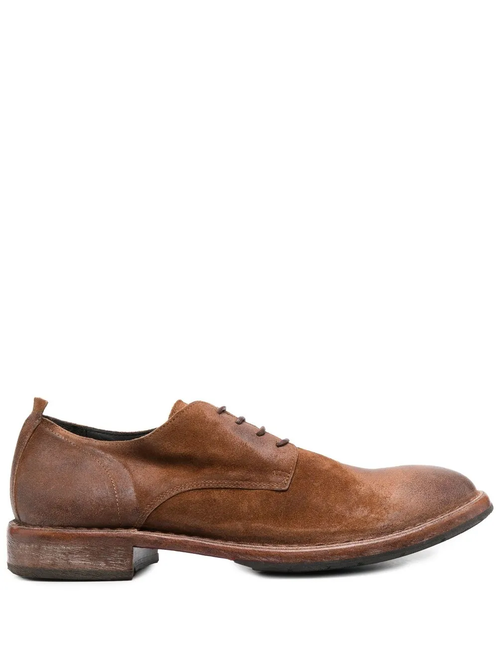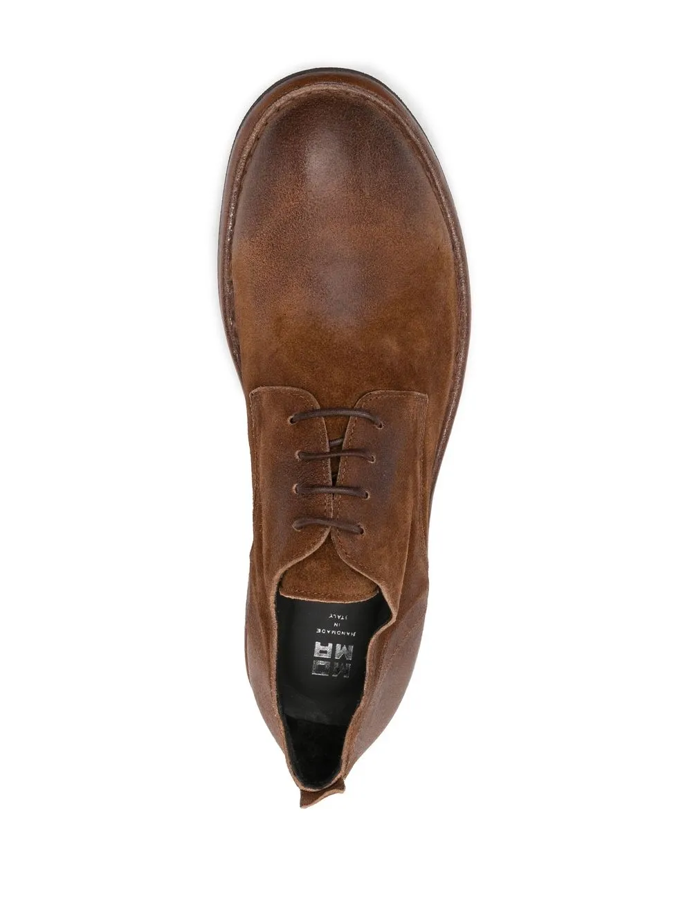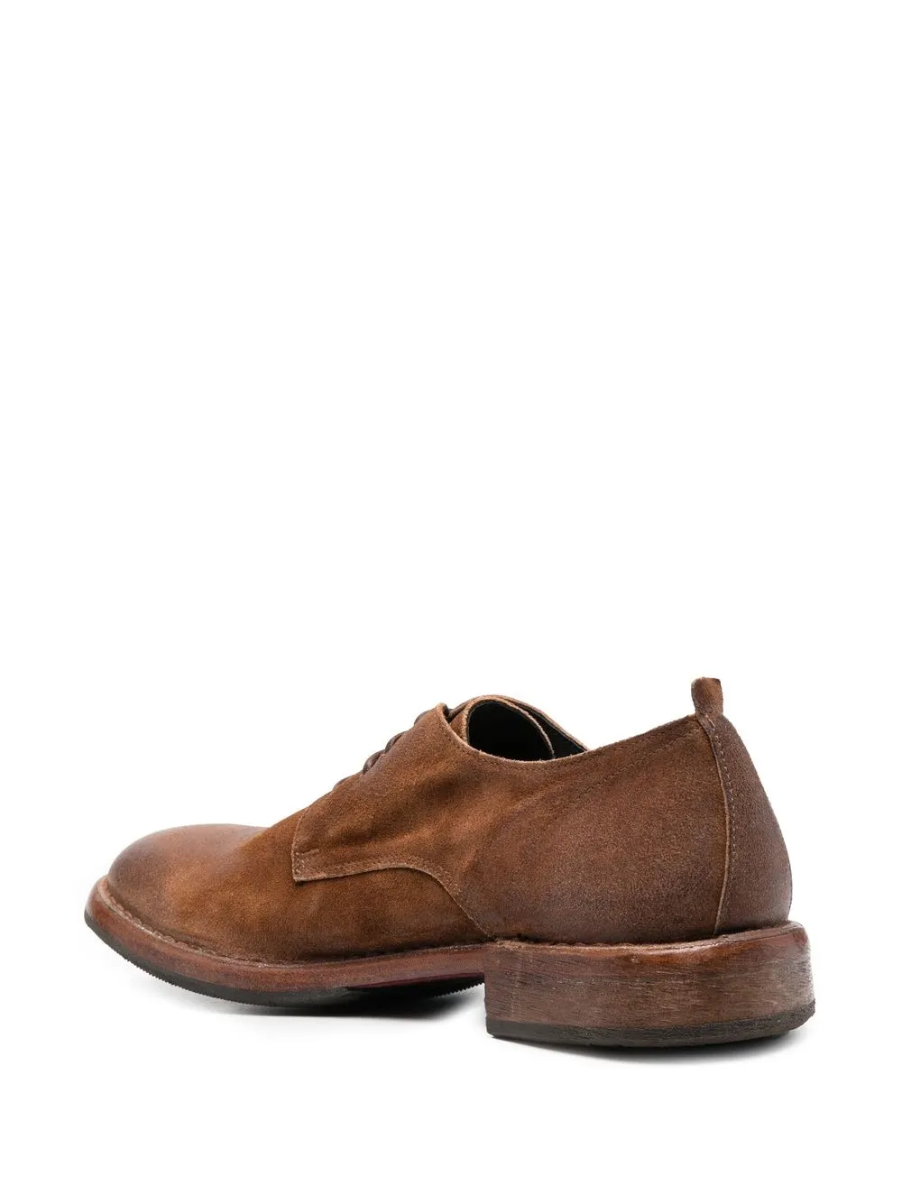 Marrón, piel de becerro, acabado bruñido, puntera redonda, cierre con cordones en la parte delantera y tacón cuadrado bajo.