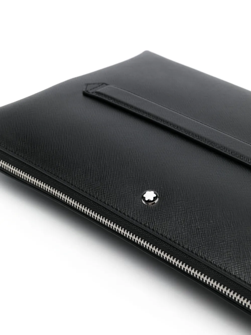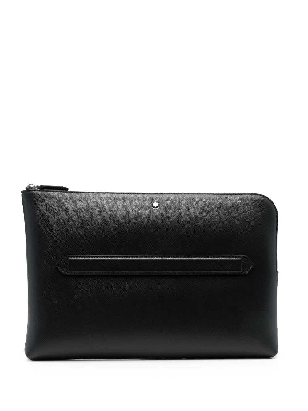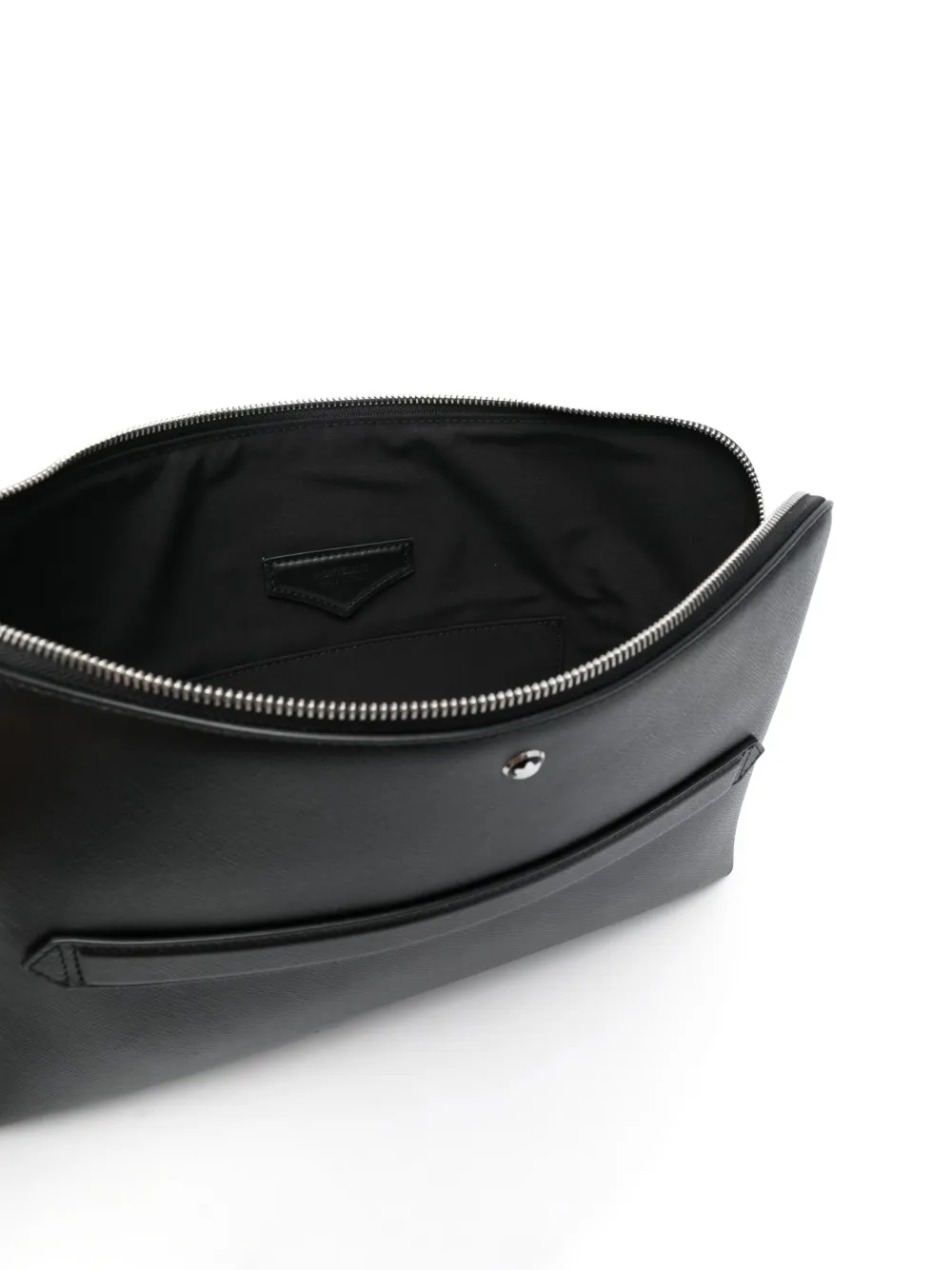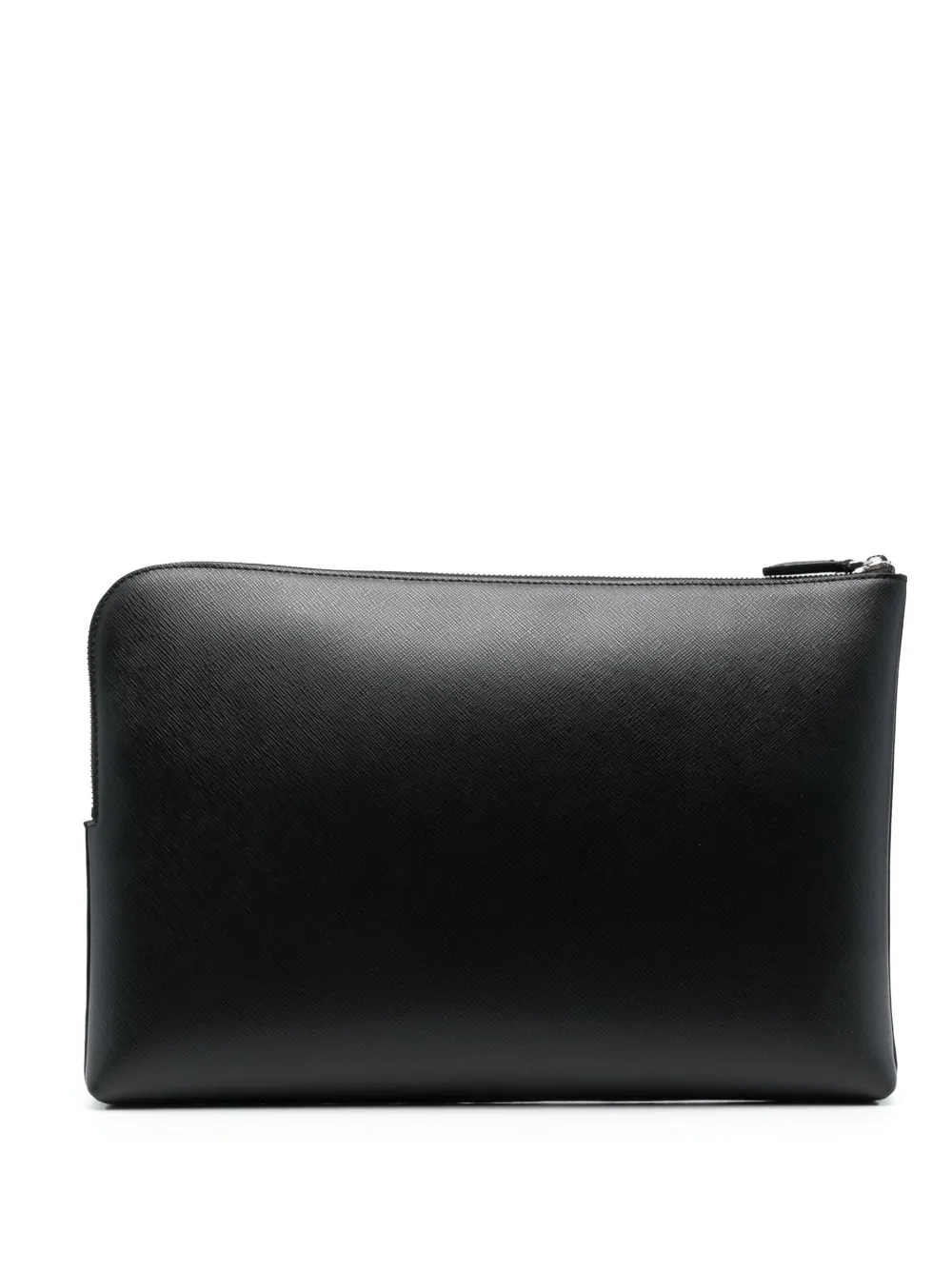 Negro, piel de becerro, placa del logo, cierre con cremallera en el tope y compartimento principal.