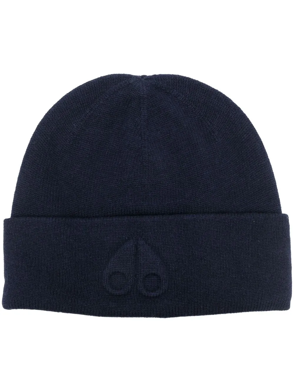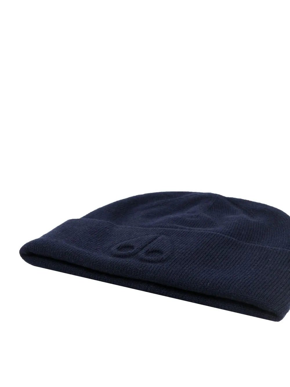 Azul, lana, punto de canalé, parche del logo en la parte delantera y ala con vuelta.
