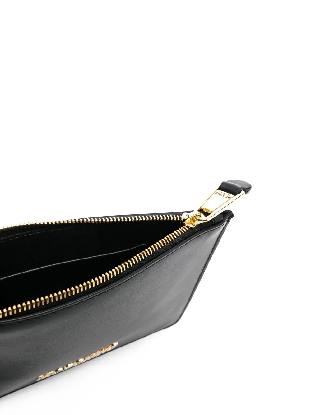 Negro carbón, piel de becerro, logo con letras doradas, compartimento con cierre de cremallera y correa de muñeca removible.