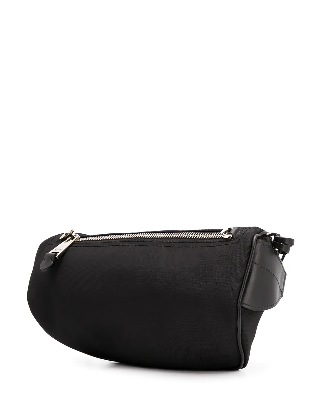 Riñonera con logo estampado en cuero de color negro de Moschino con correa clásica, cierre con cremallera en la parte delantera, compartimento interno, bolsillo interno con cremallera y colgante estilo llavero.