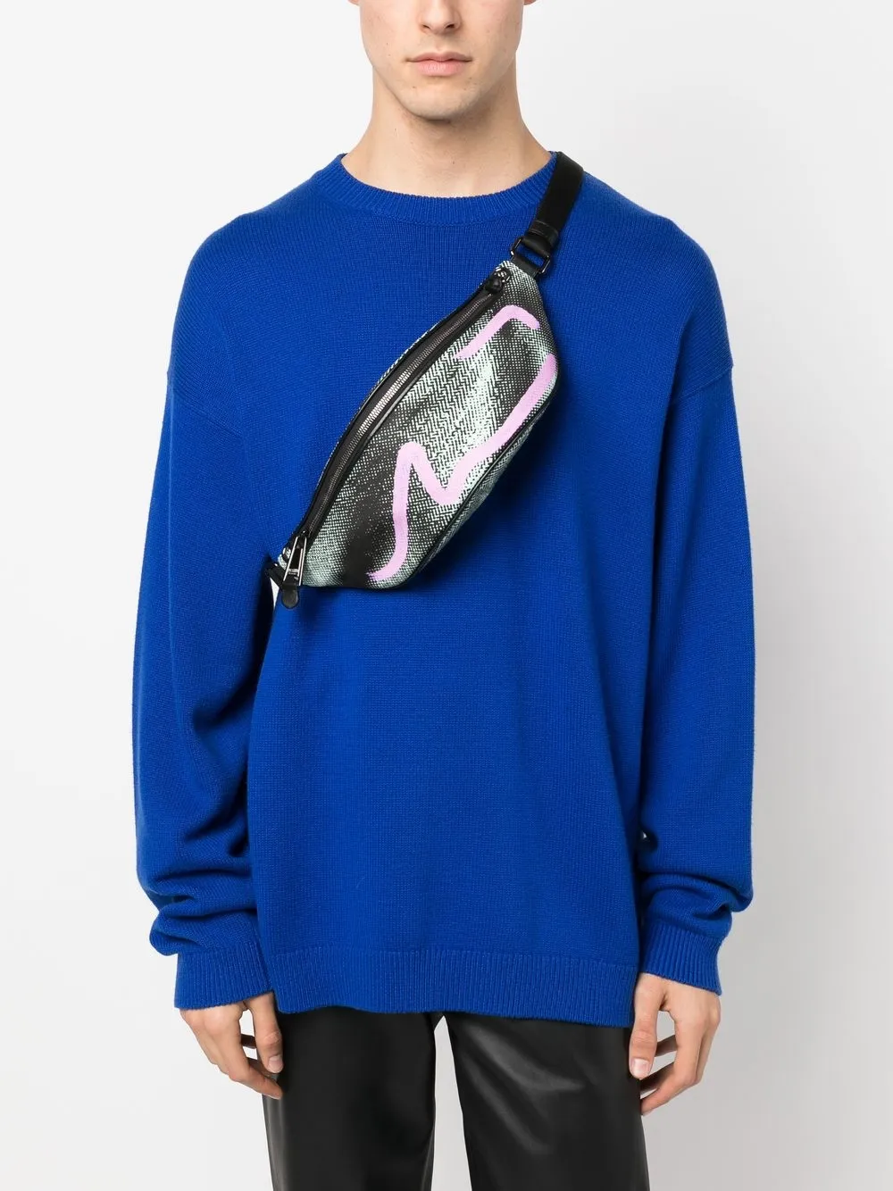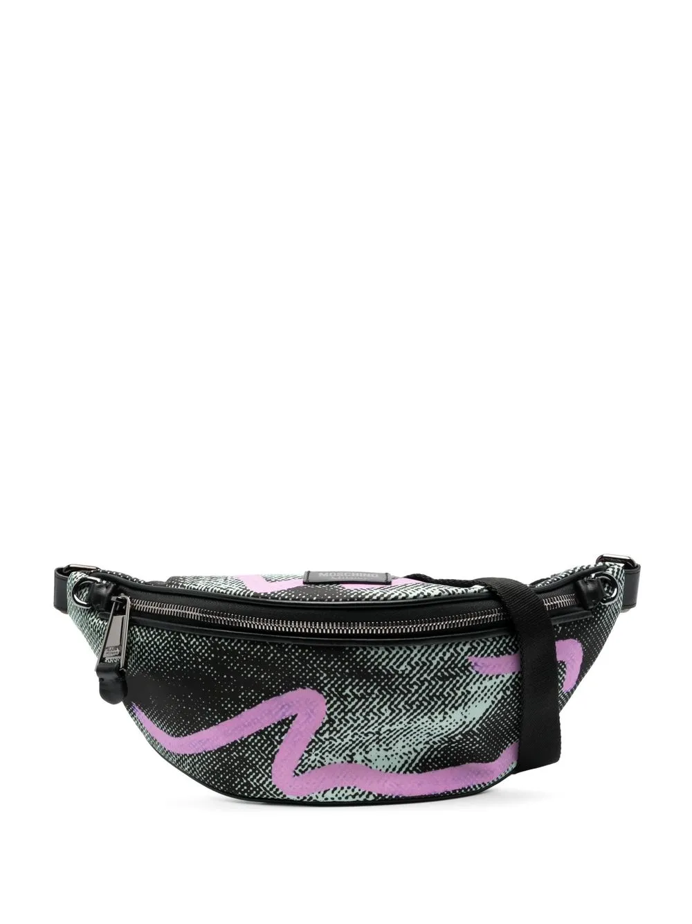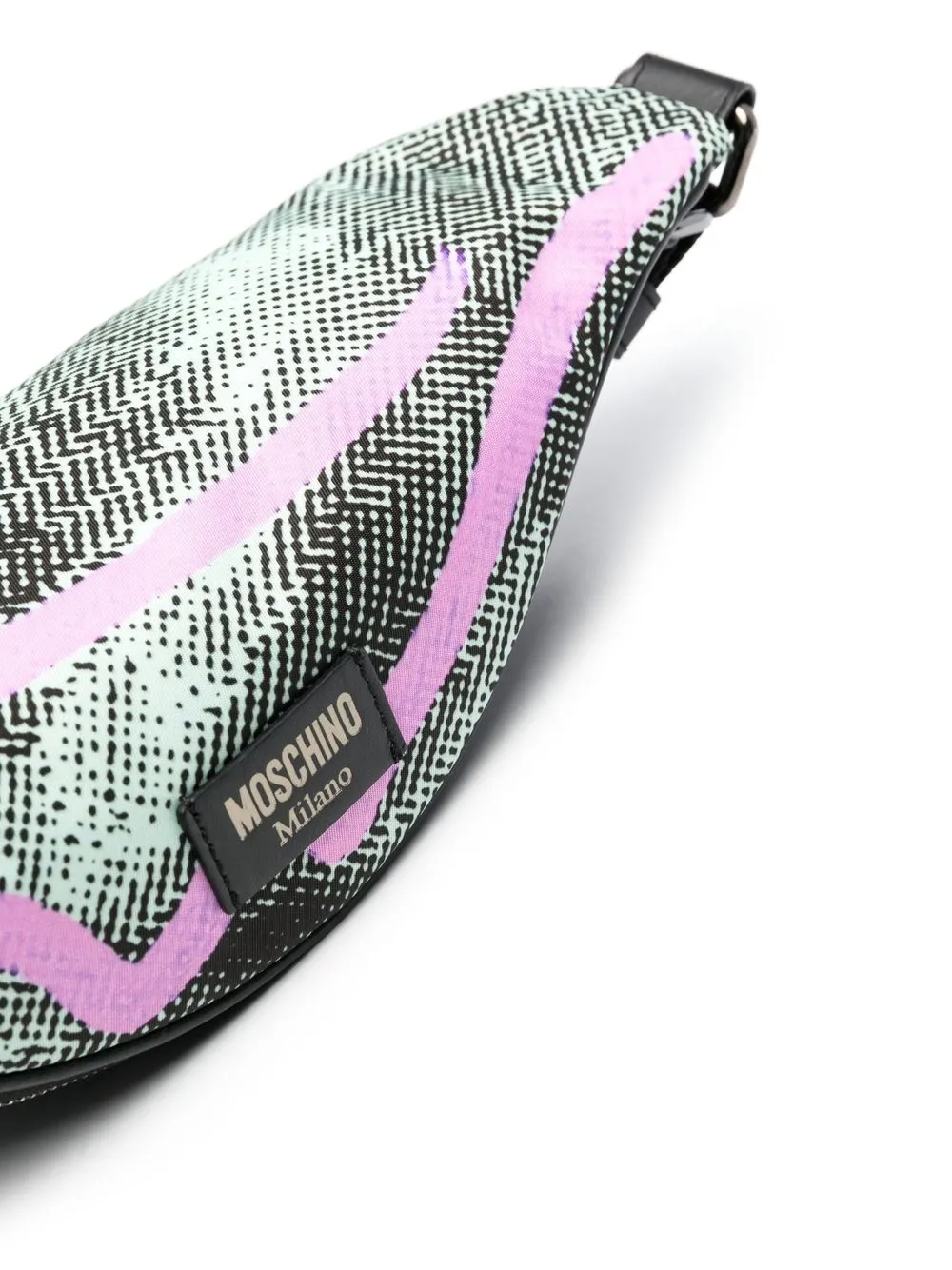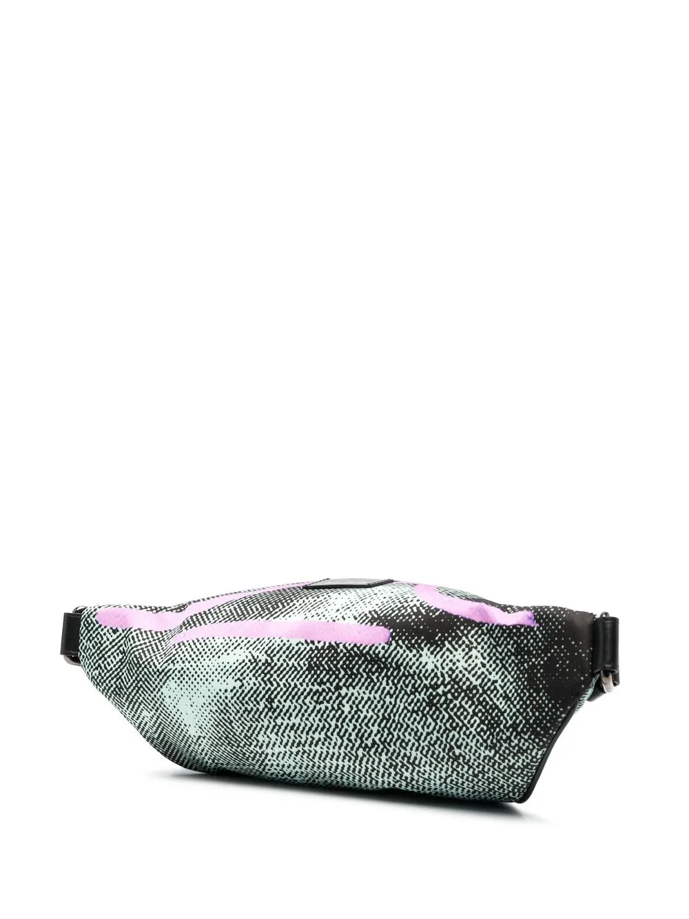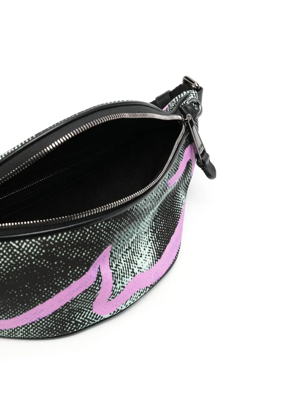 Negro carbón, estampado abstracto, parche del logo en la parte delantera, correa de hombro ajustable, cierre con cremallera en el tope y compartimento principal.