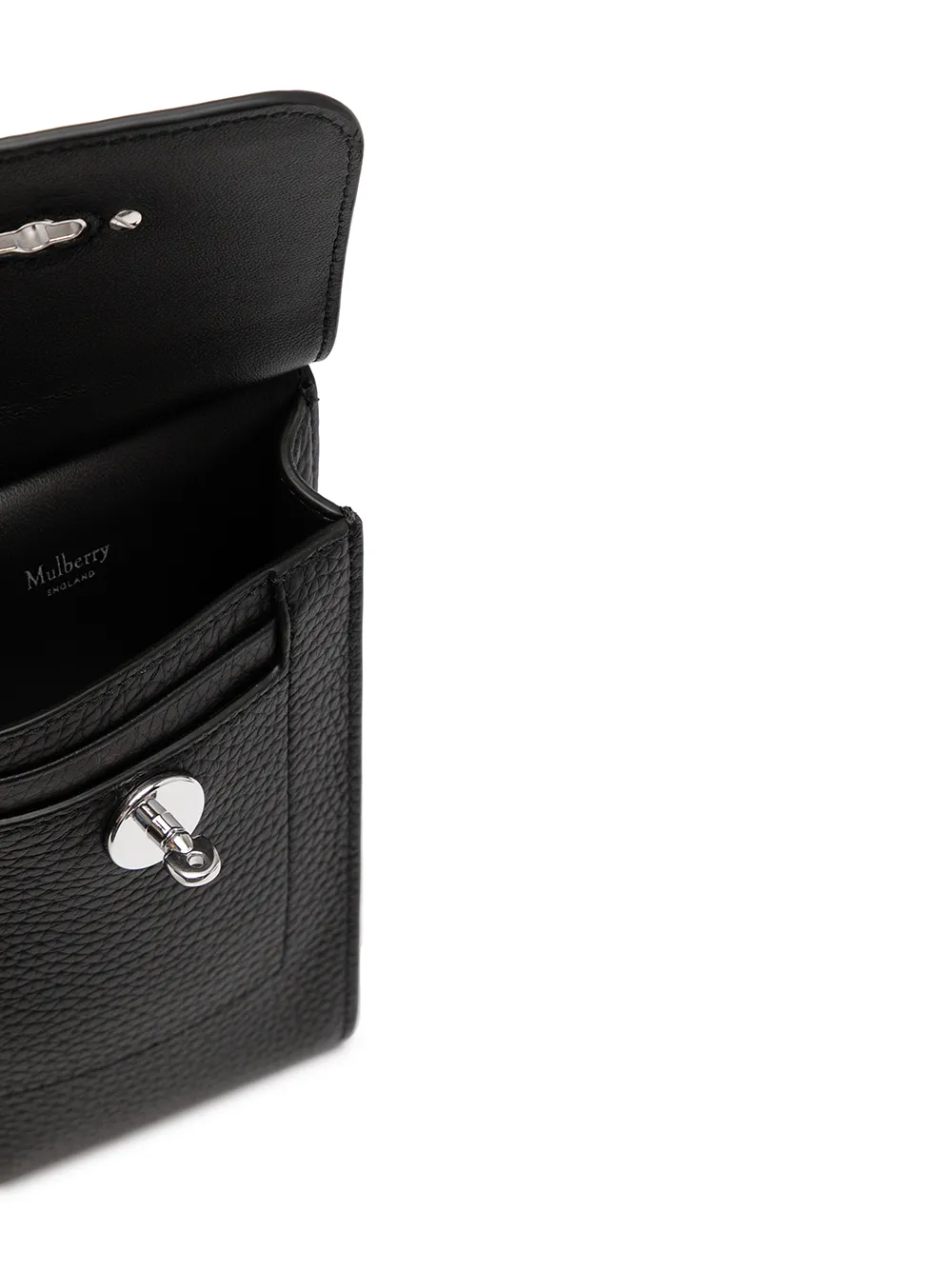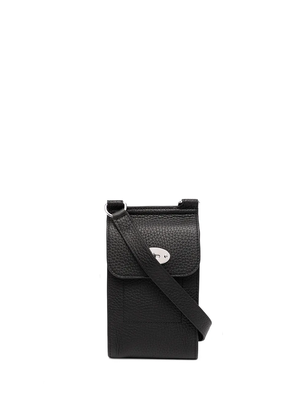 Textura granulada, acabado en tono plateado, correa de hombro ajustable, parte superior plegable, cierre giratorio, compartimento principal, compartimentos para tarjetas y bolsillo en la parte posterior. Material: cuero.