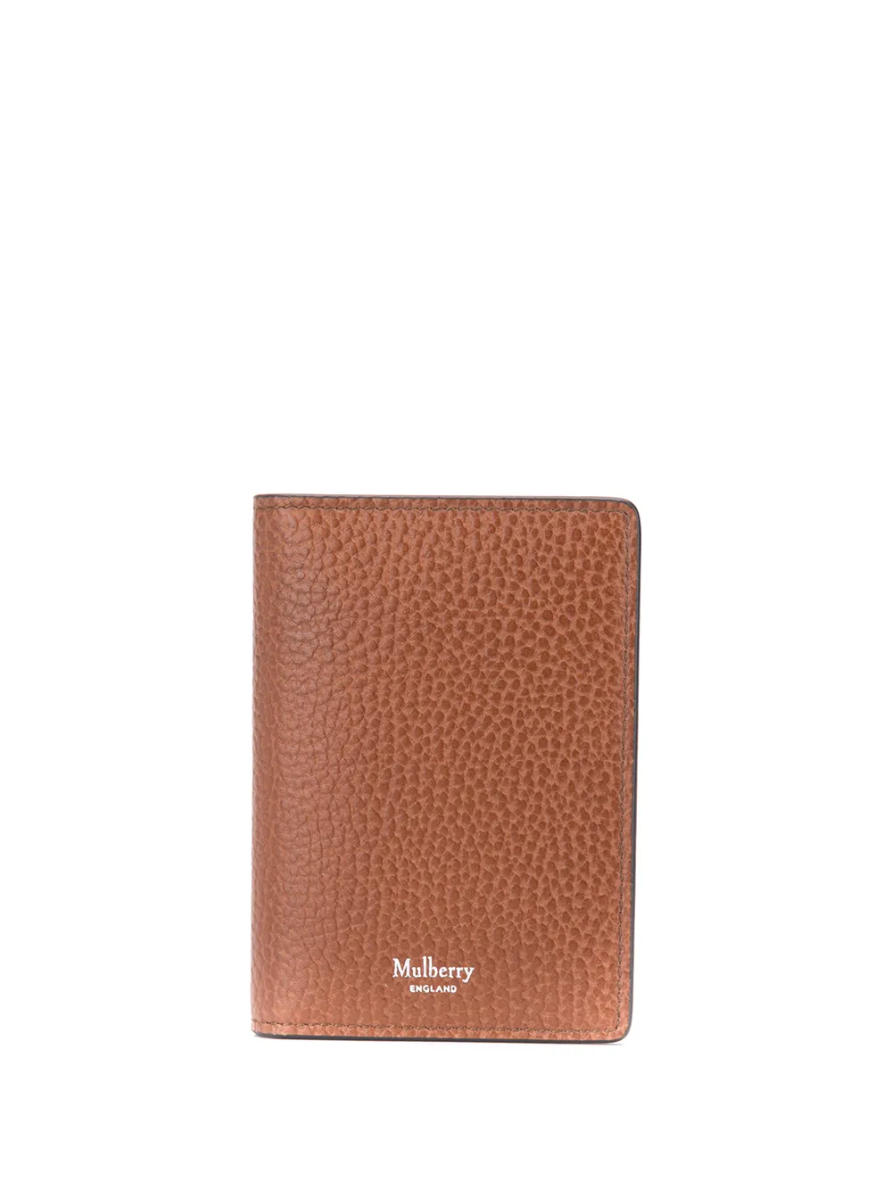 Cartera granulada de color marrón de Mulberry con forma rectangular, logo en el frente y múltiples compartimentos para tarjetas en el interior.