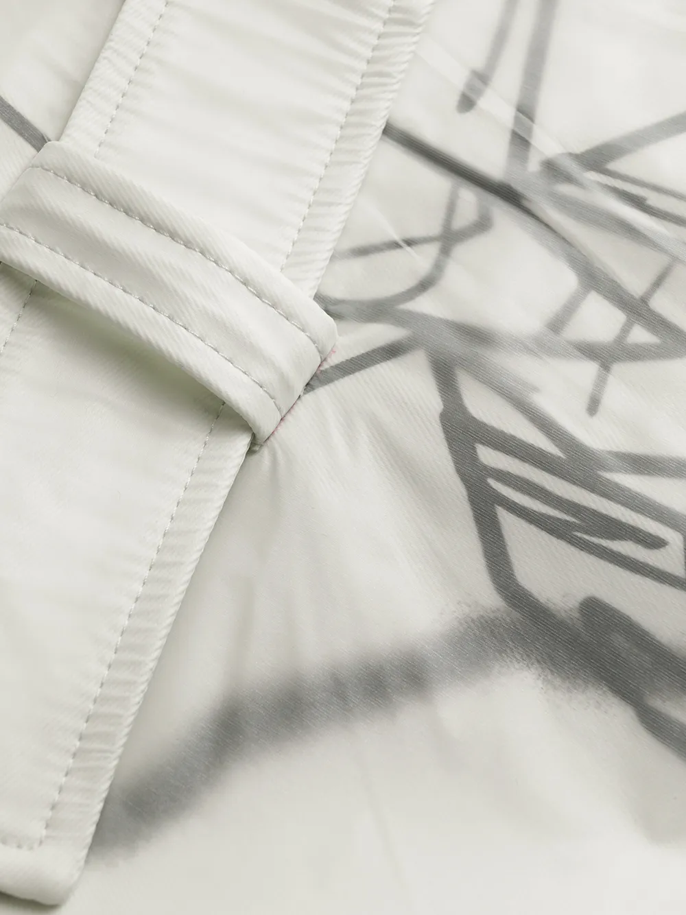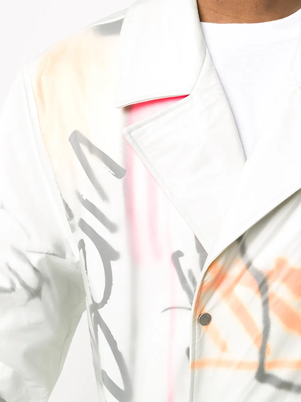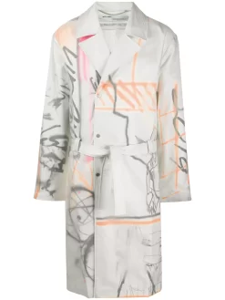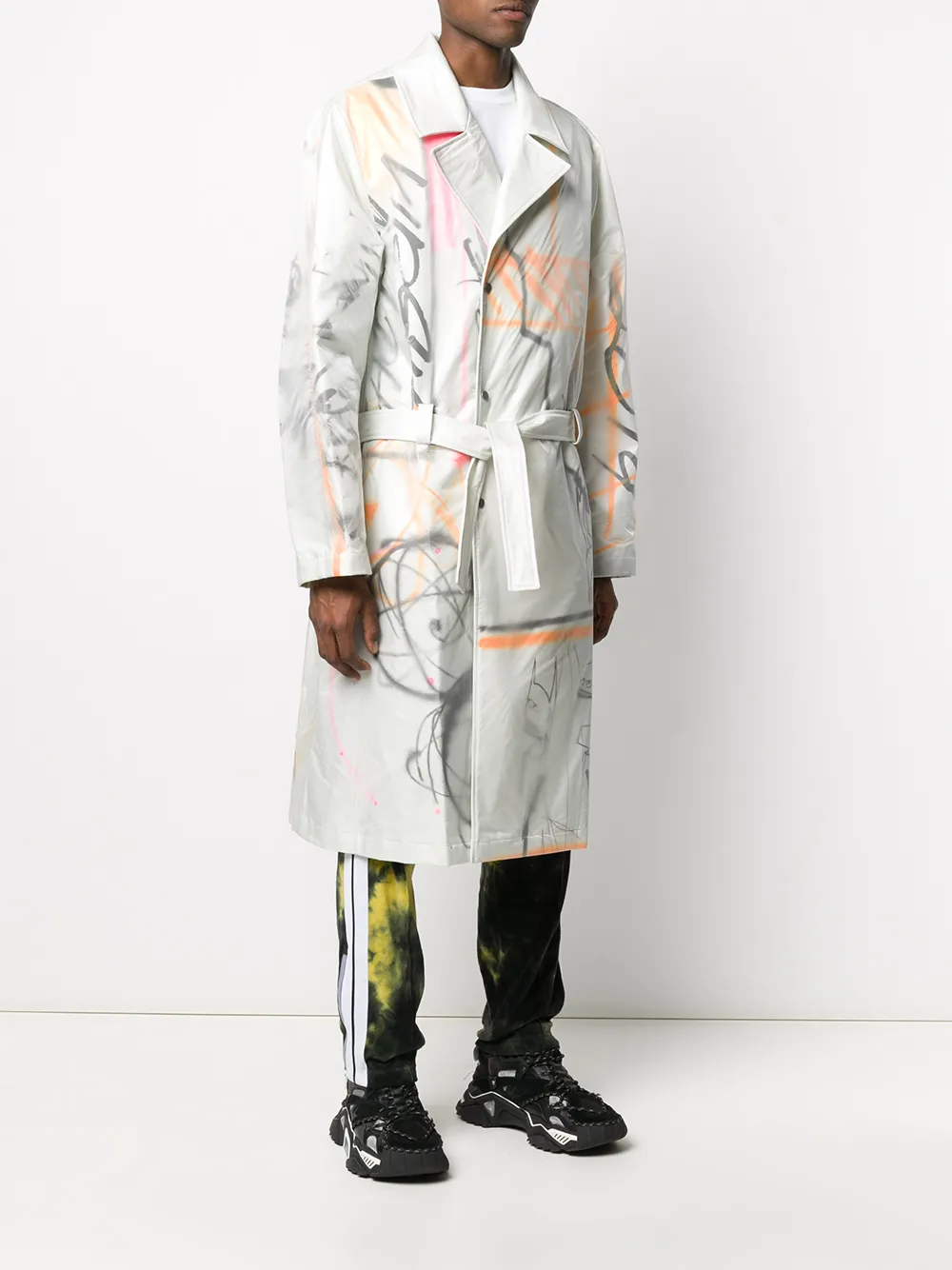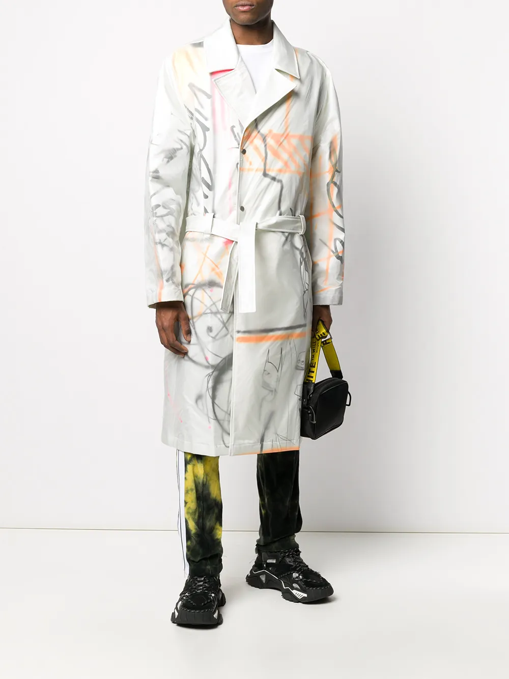 Gabardina Futura de color blanco de Off-White con solapa de muesca, cierre descentrado con botones en el frente, cinturón, abertura central en la parte posterior, manga larga y diseño midi.