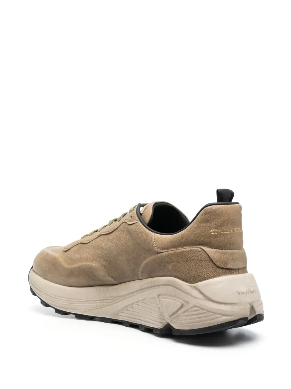 Beige almendra, piel de becerro, textura granulada, logo con letras doradas, costuras del mismo tono, puntera redonda, cierre con cordones en la parte delantera, plantilla de piel con logo y suela gruesa de goma.