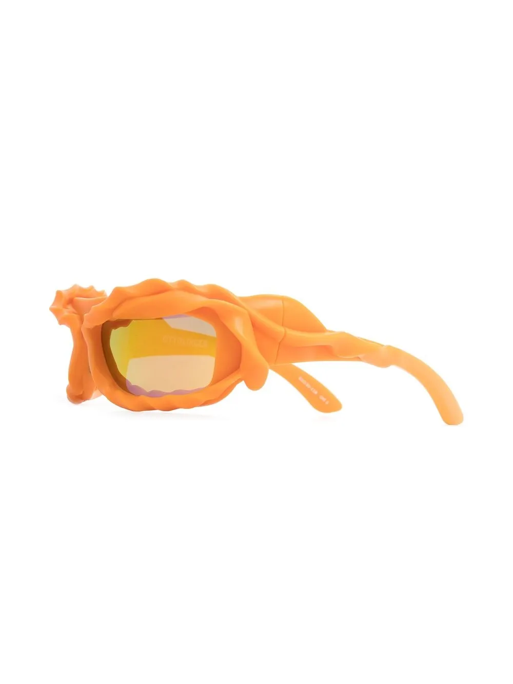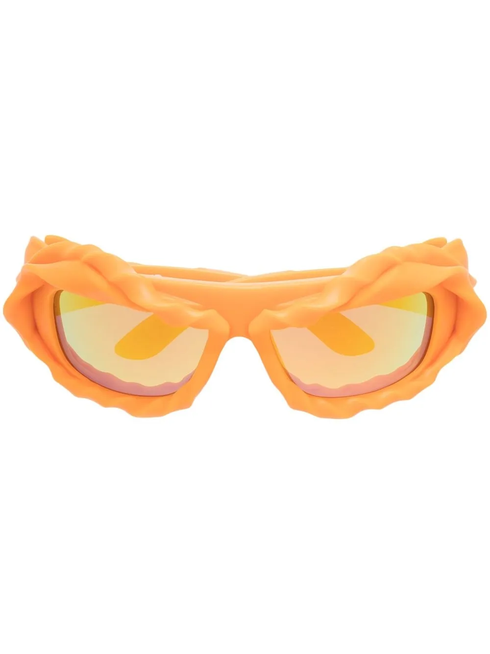 Naranja zanahoria, acetato, detalle retorcido, lentes de color naranja y patillas esculpidas.