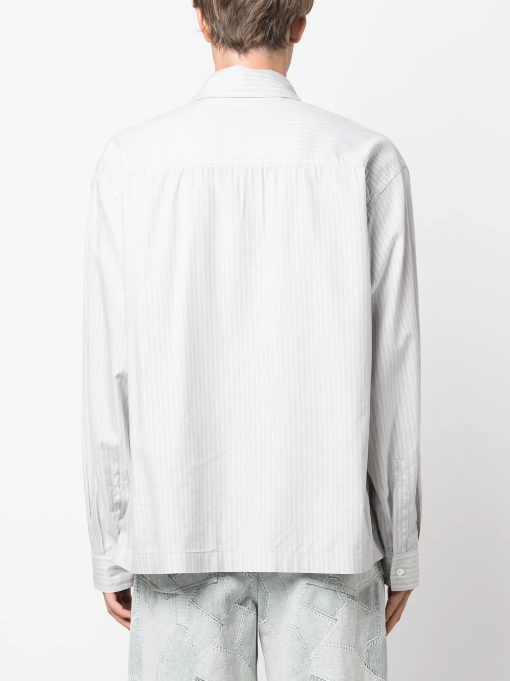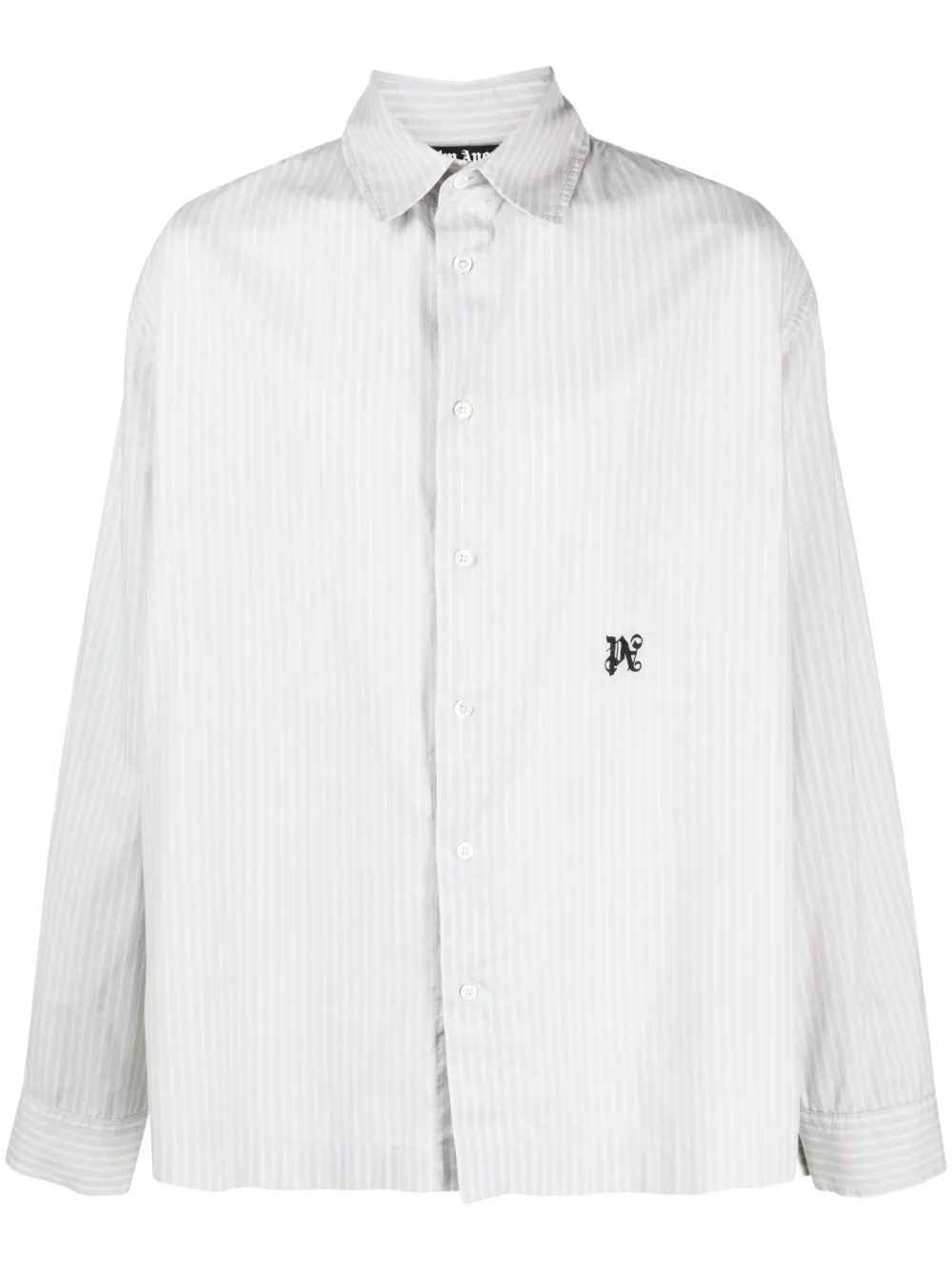Azul claro, crudo, algodón, diseño ligero, estampado de raya vertical, logo bordado en el pecho, cuello clásico, botones en la parte delantera, botones con logo grabado, hombros caídos, manga larga, puños con botón y dobladillo recto.