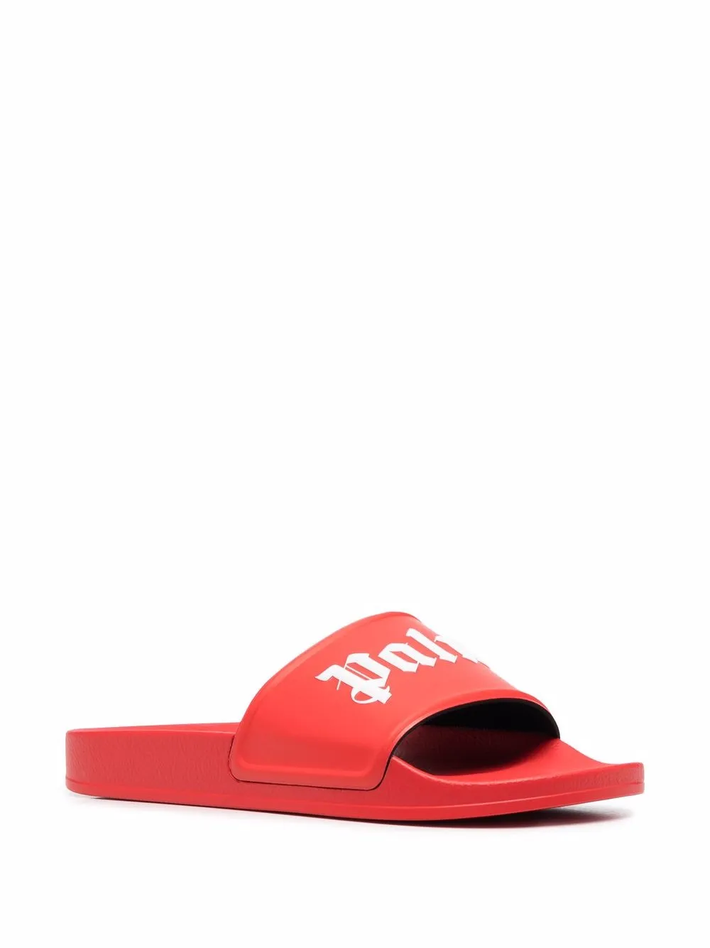 Sandalias con logo estampado de color rojo y blanco de Palm Angels con estampado del logo en la parte delantera, puntera abierta, puntera redonda, estilo slip-on y suela de goma.