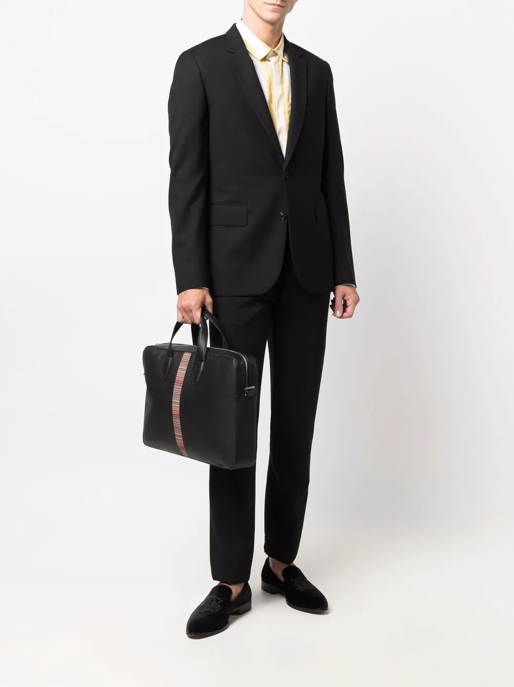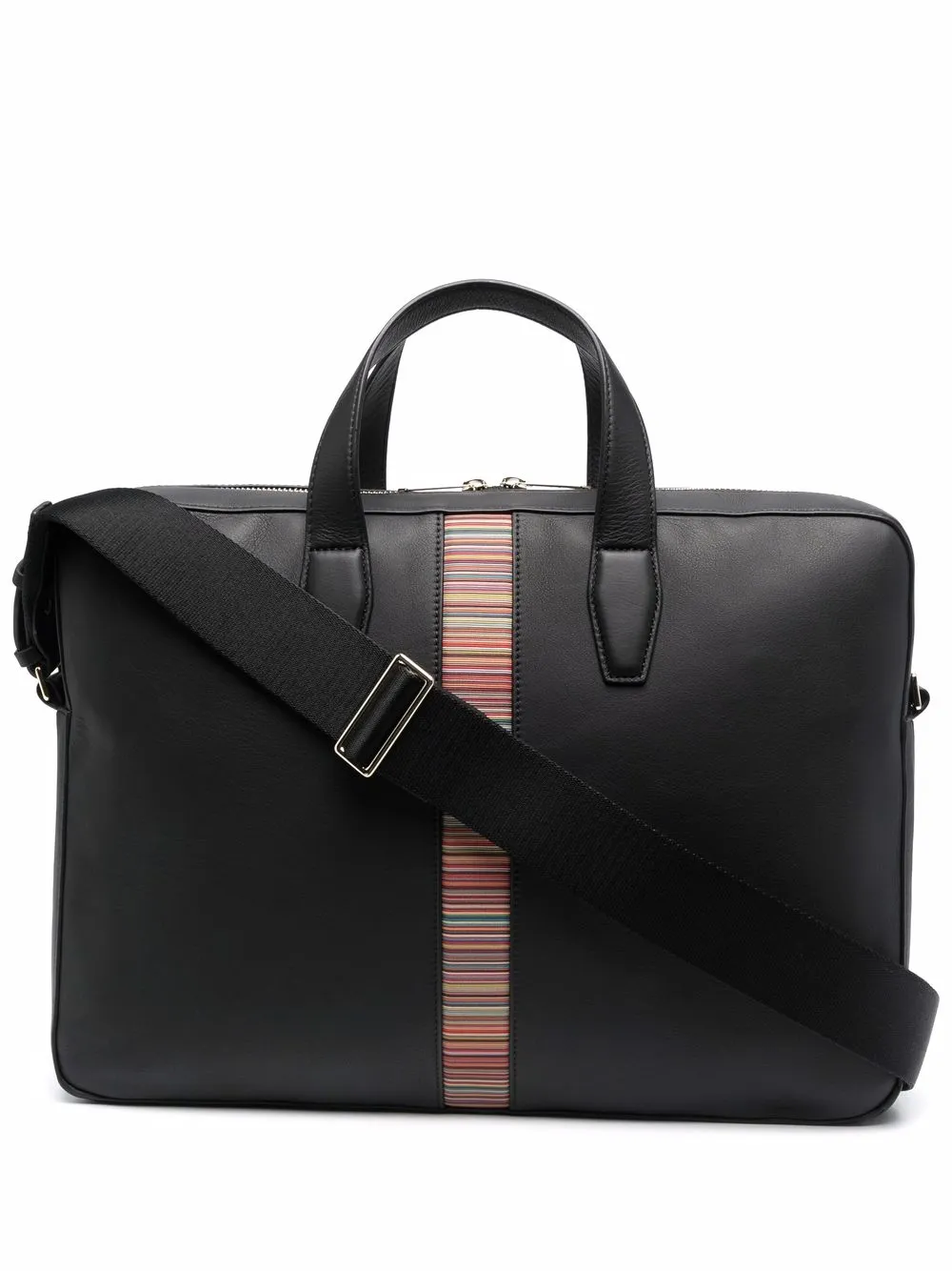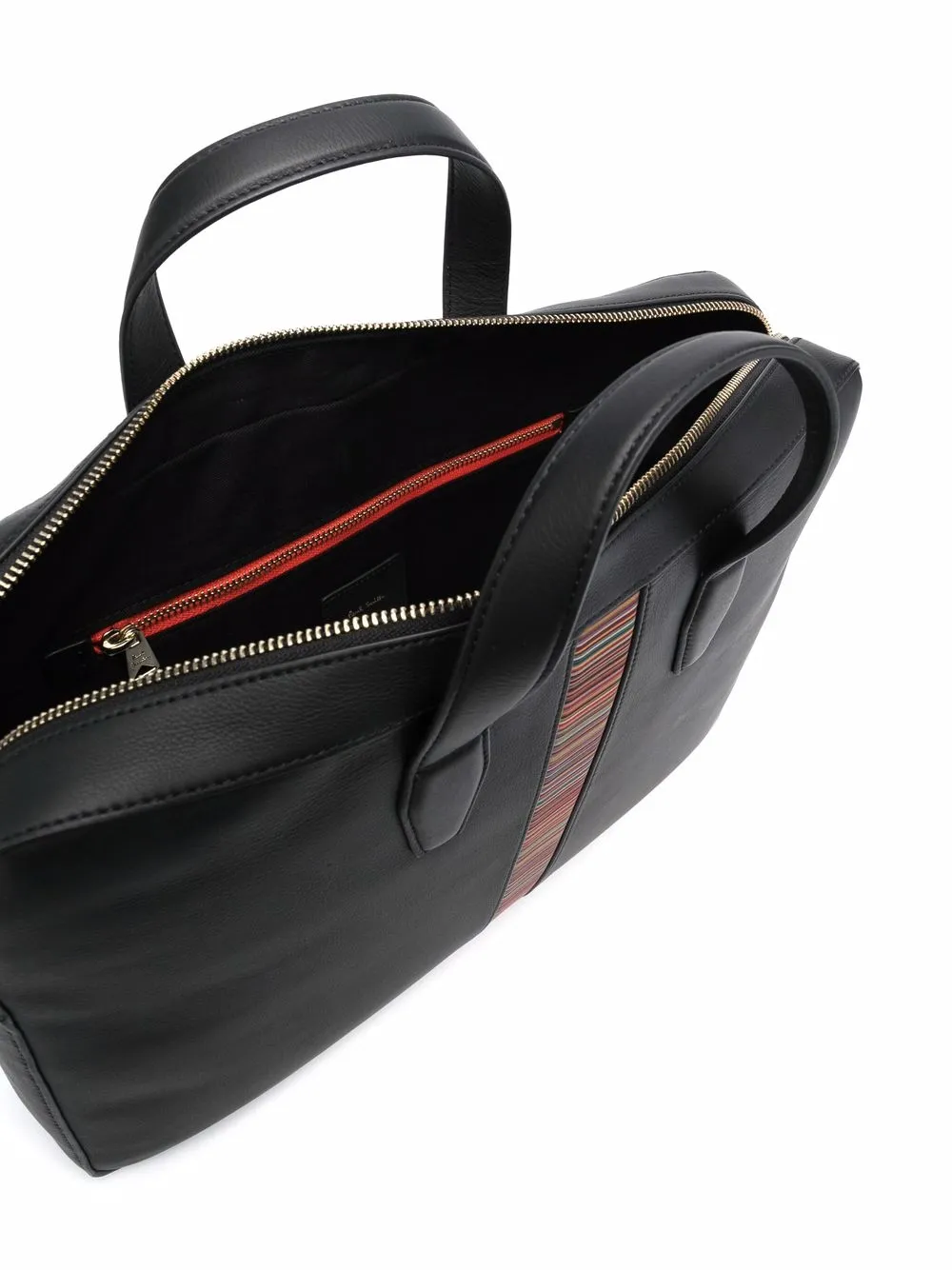 Detalle de cinta adhesiva, cremallera de doble sentido, dos asas redondas en la parte superior, correa ajustable y removible para el hombro y bolsillo interno con cremallera. Material: cuero.