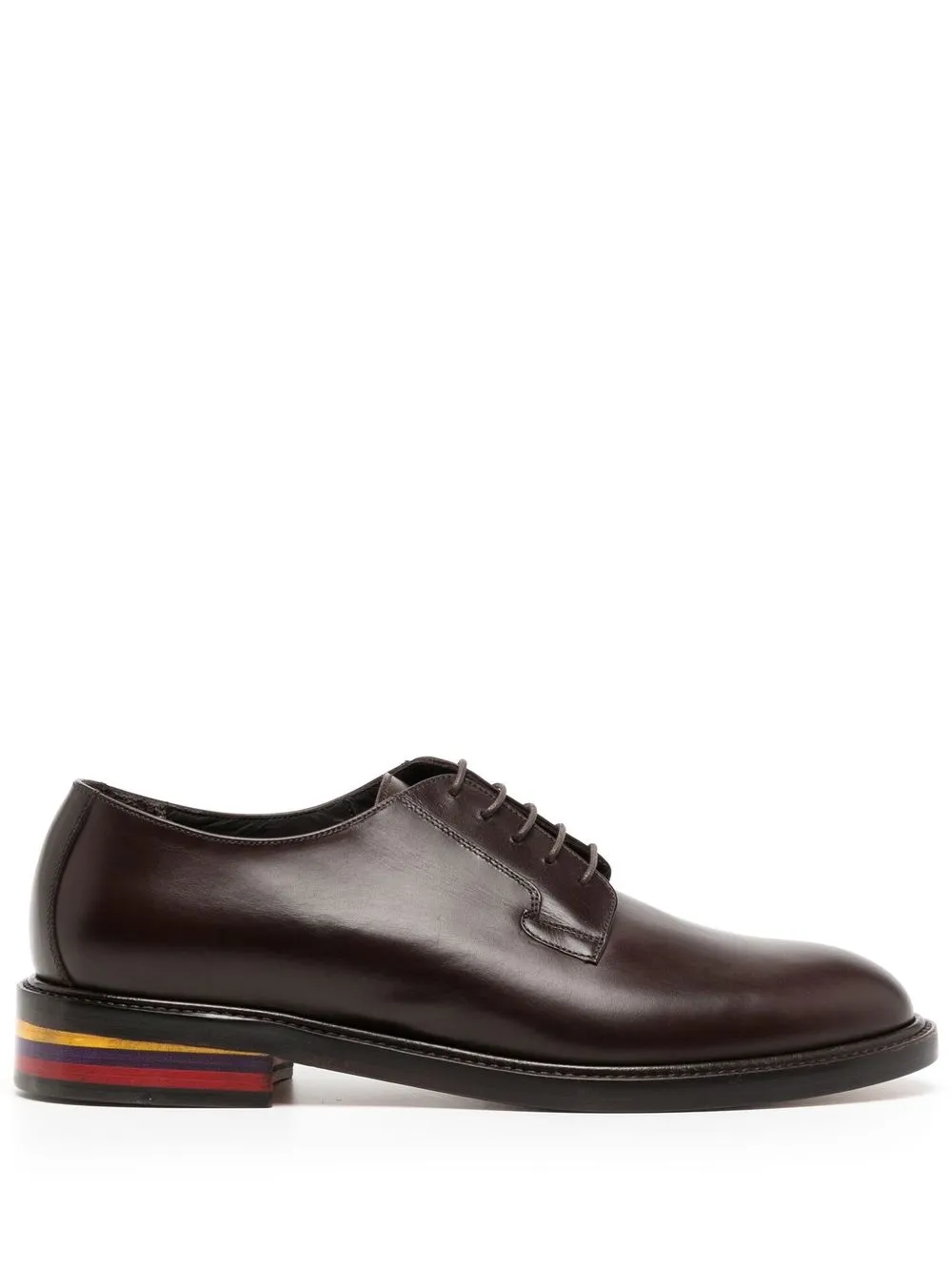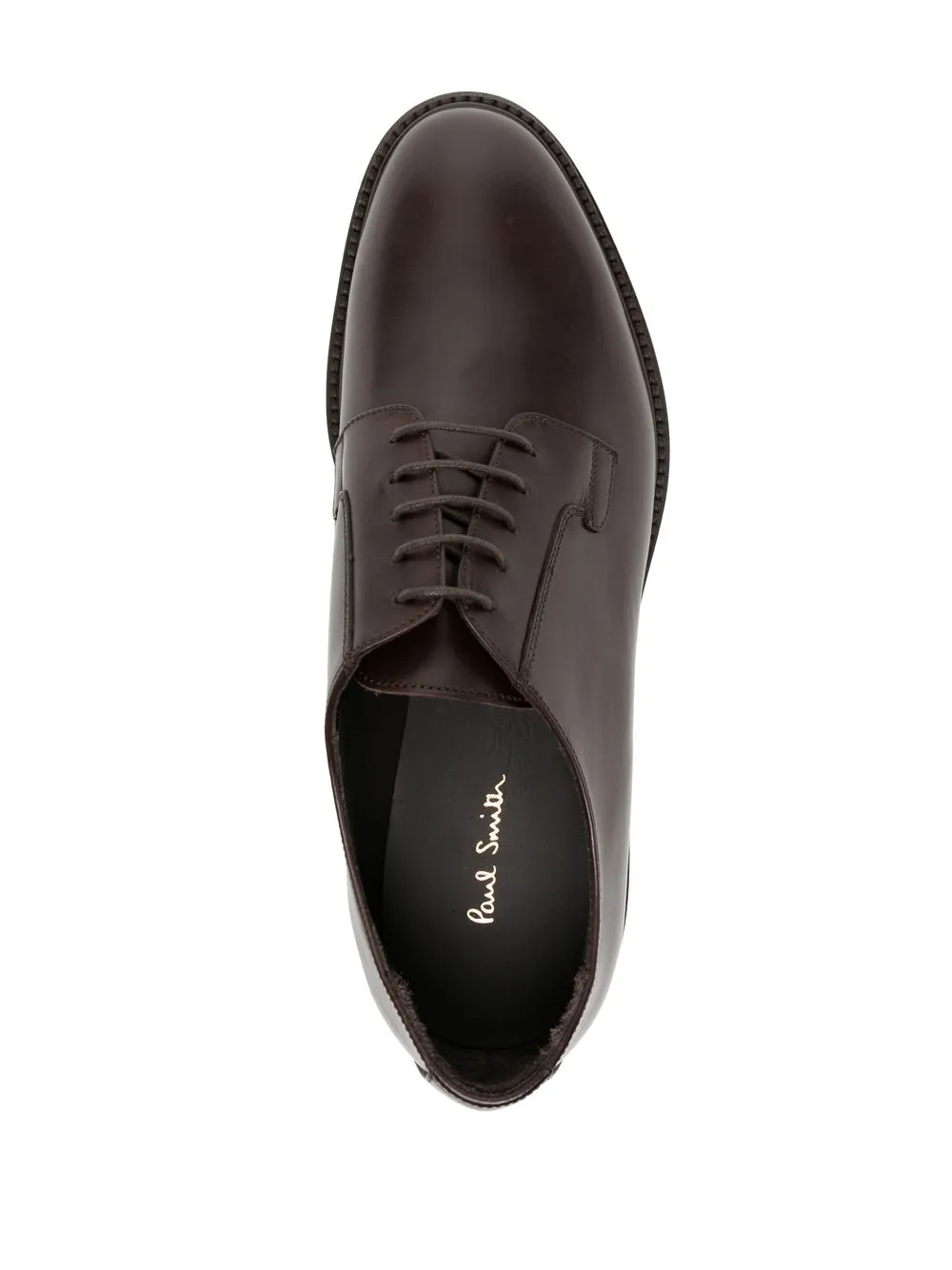 Marrón chocolate, cierre con cordones en la parte delantera, plantilla de piel con logo, puntera de almendra, suela plana de cuero y tacón cuadrado bajo.