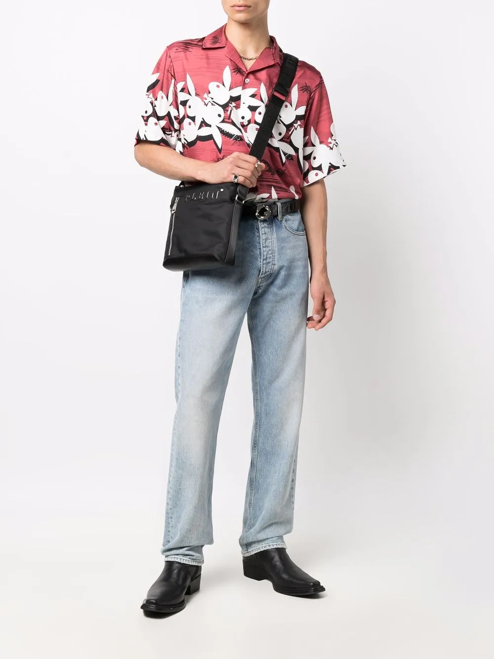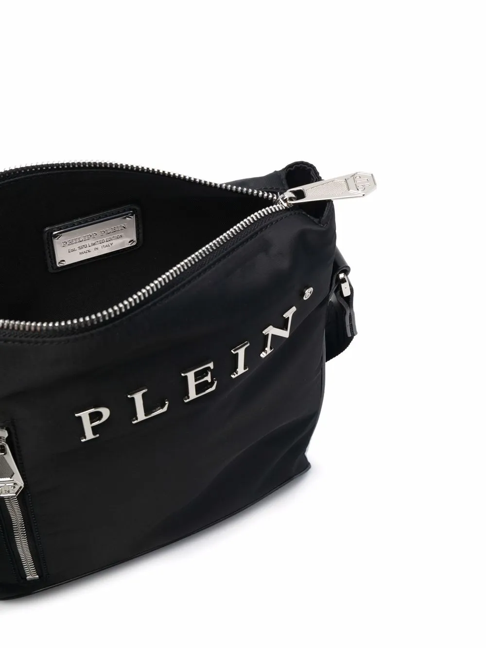 Diseño con un único tirante, letras del logo, bolsillo con cremallera en la parte delantera, cierre con cremallera en el tope y placa del logo en el interior.