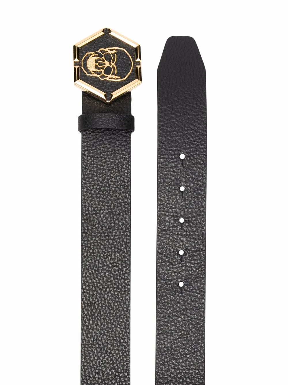 Efecto texturizado, aplique de calavera, acabado en tono dorado, cierre con hebilla, detalle de agujeros y diseño ajustable. Material: piel de becerro.