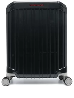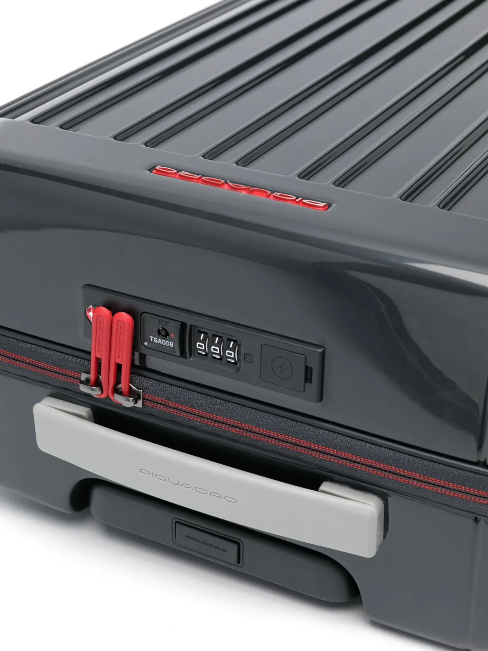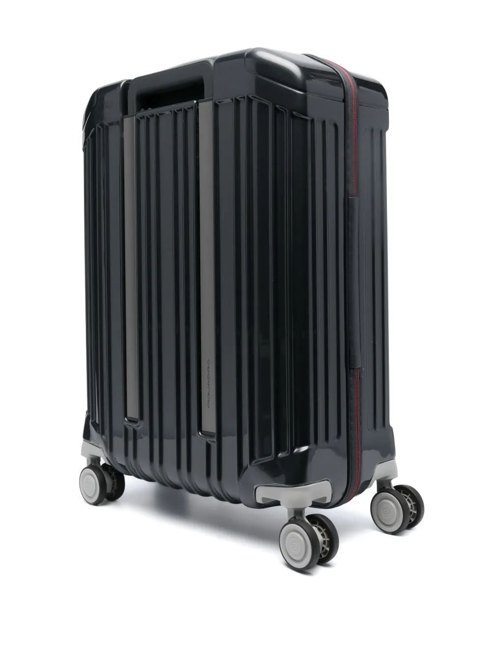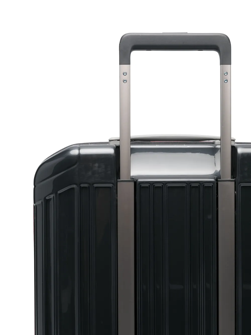 Gris oscuro, placa del logo, forma rectangular rígida, cuatro ruedas, asa extensible, cierre con cremallera en el contorno, compartimento dividido y bolsillo interno con cremallera.
