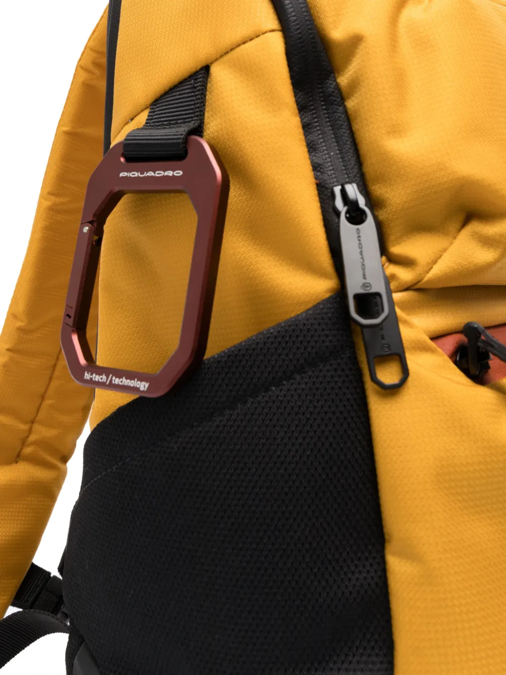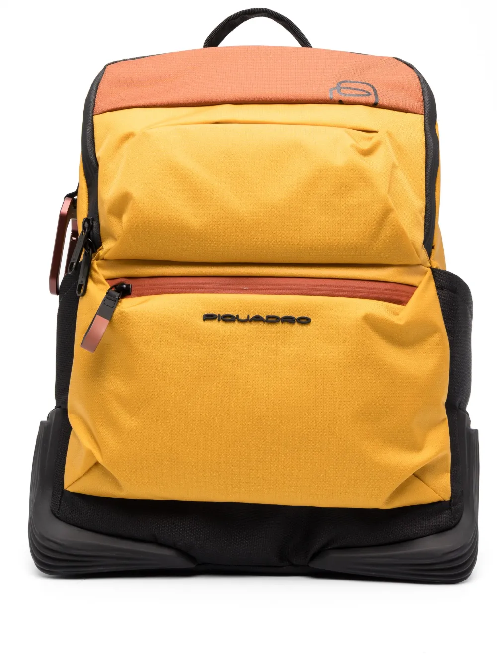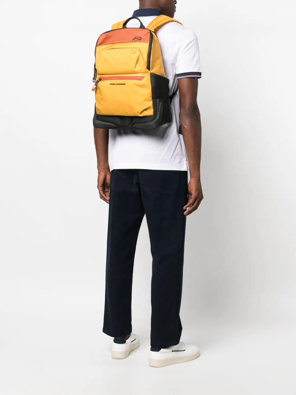 Amarillo, naranja, logo en relieve en la parte delantera, cierre con cremallera en el contorno, asa plana en la parte superior, correas de hombro ajustables y bolsillo con cremallera en la parte delantera.