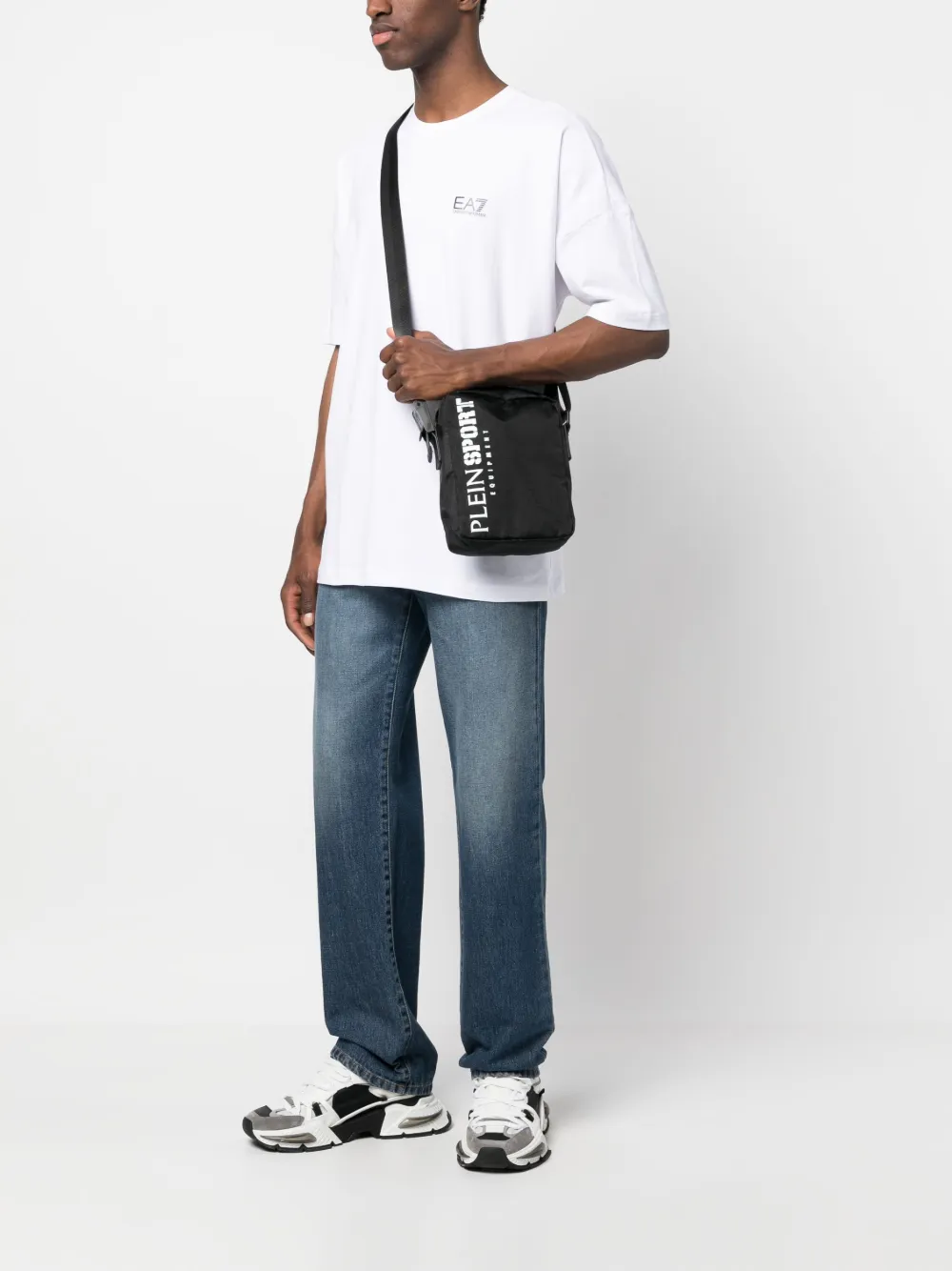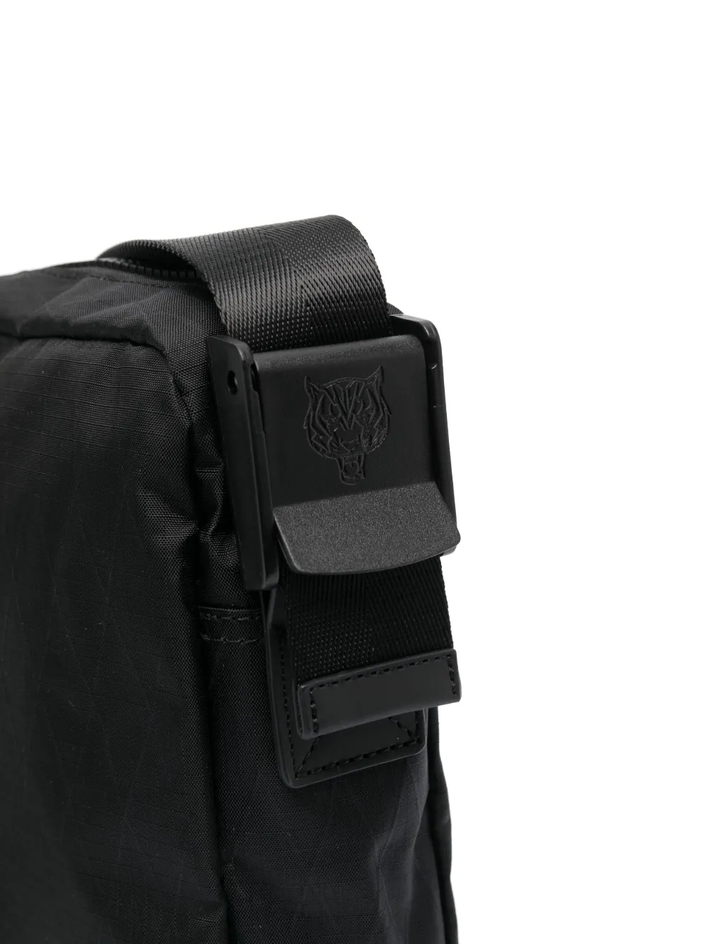 Negro y blanco, textura de ripstop, estampado del logo en la parte delantera, correa de hombro ajustable, cierre con cremallera en el tope y compartimento principal.