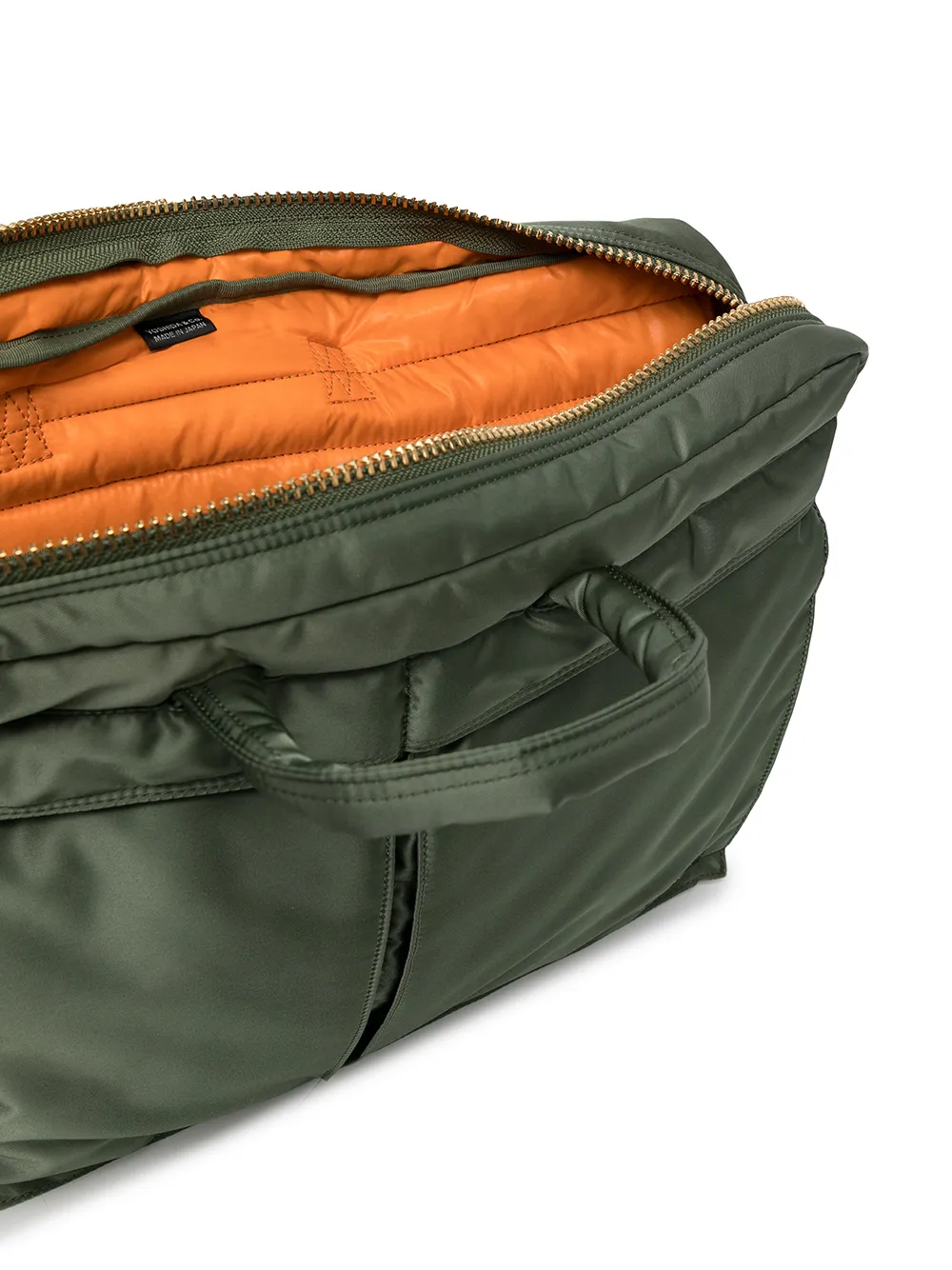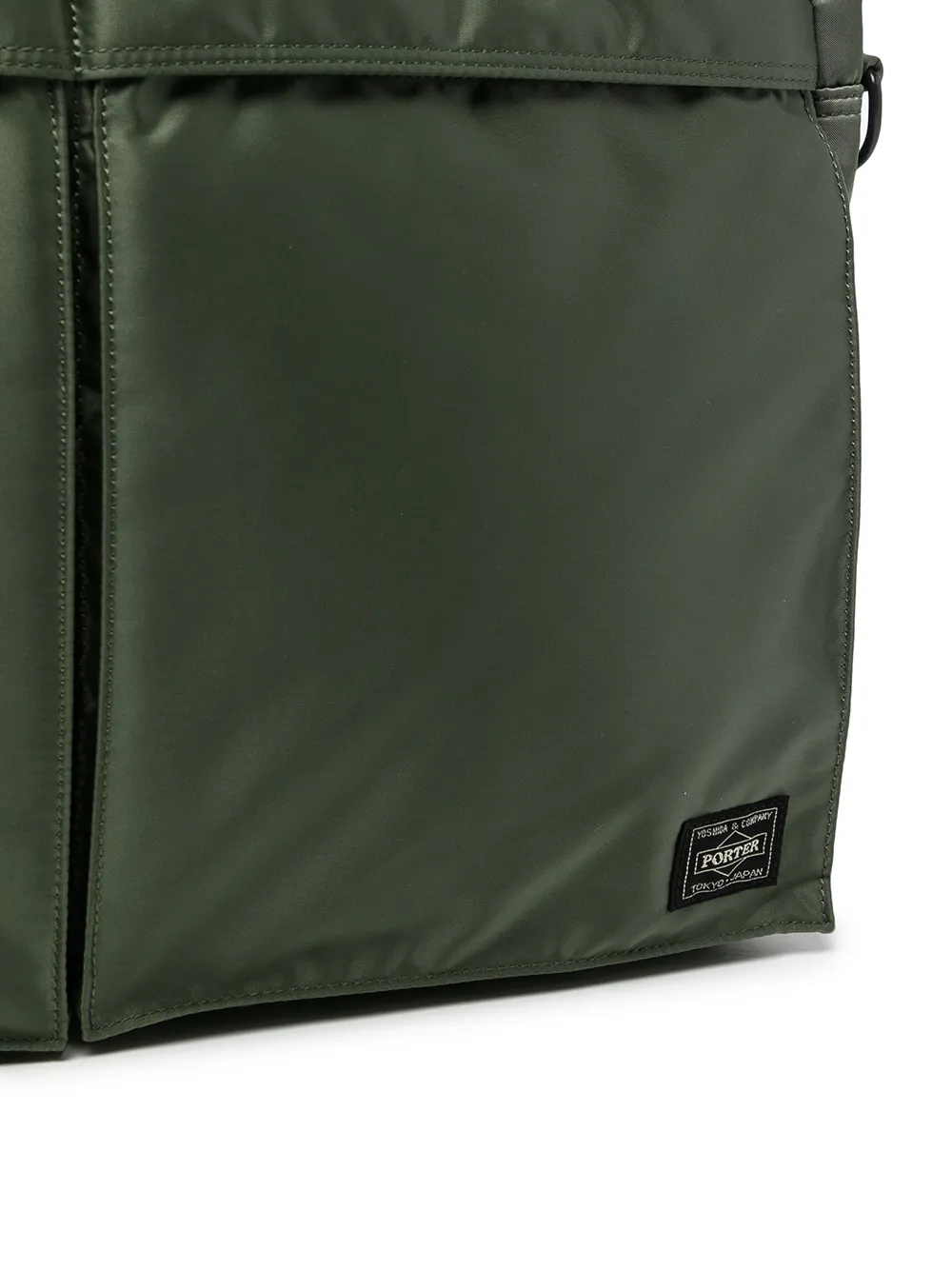 Parche del logo en la parte delantera, dos asas redondas en la parte superior, bolsillo con cremallera en la parte posterior, dos bolsillos con solapa en la parte delantera, cierre con cremallera en el tope, compartimento principal y correa ajustable y removible para el hombro.