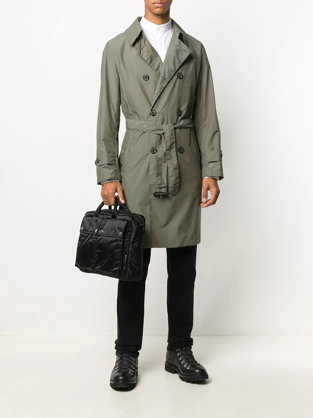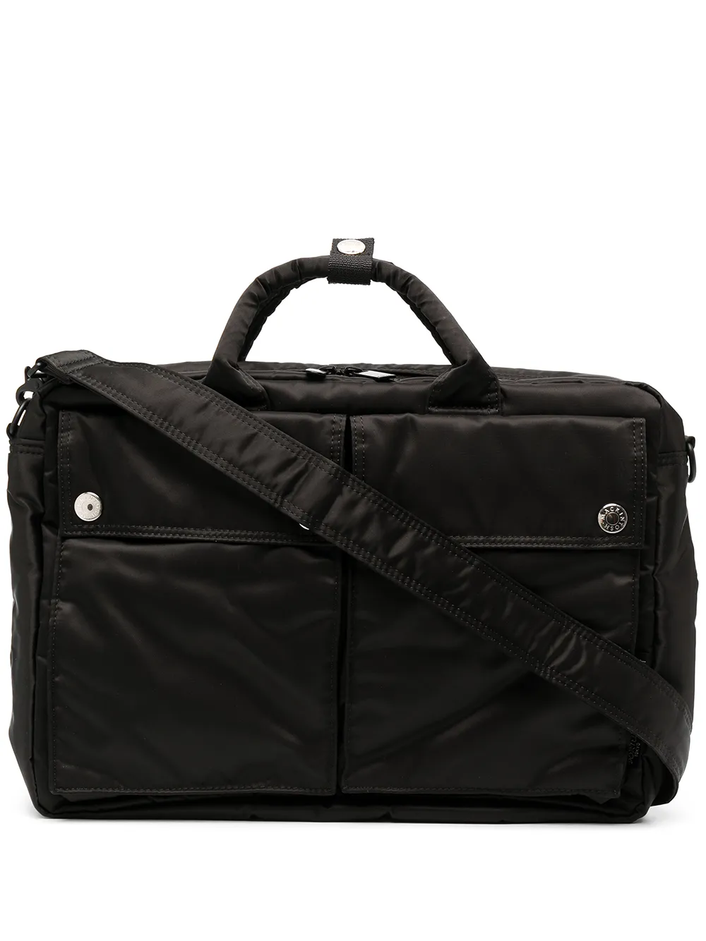 Maletín two-way con compartimentos de color color negro de Porter-Yoshida & CO con cremallera de doble sentido, correa ajustable y removible para el hombro, dos asas en la parte superior, compartimento principal, bolsillo interno y bolsillos con solapa en la parte delantera.