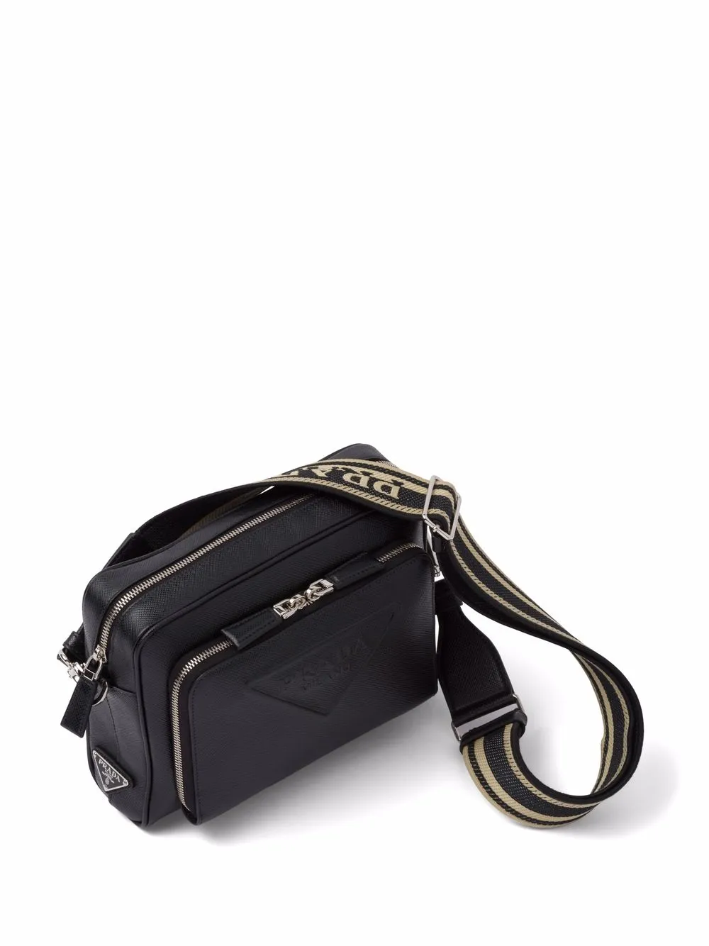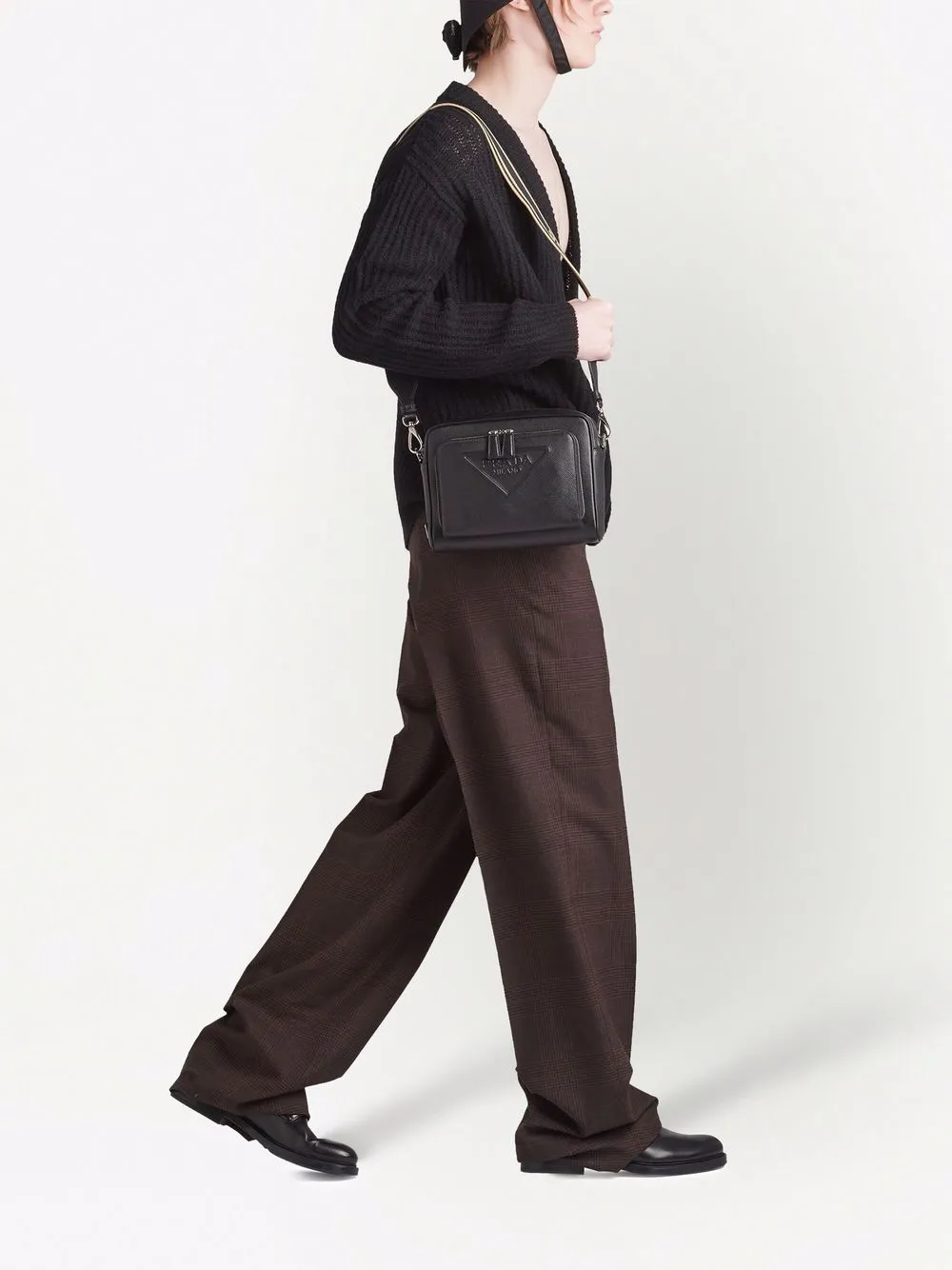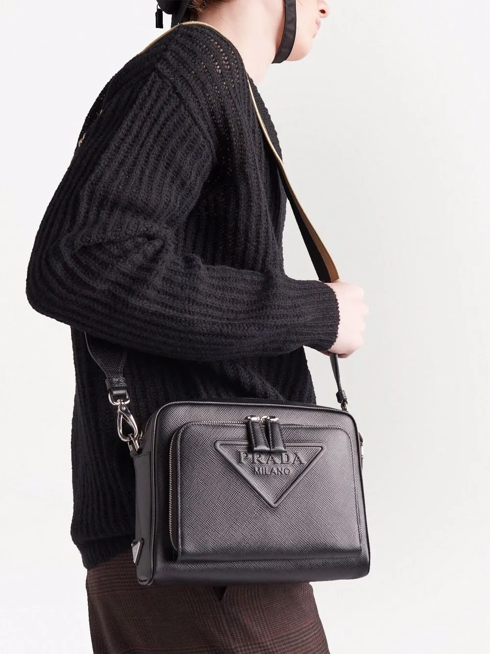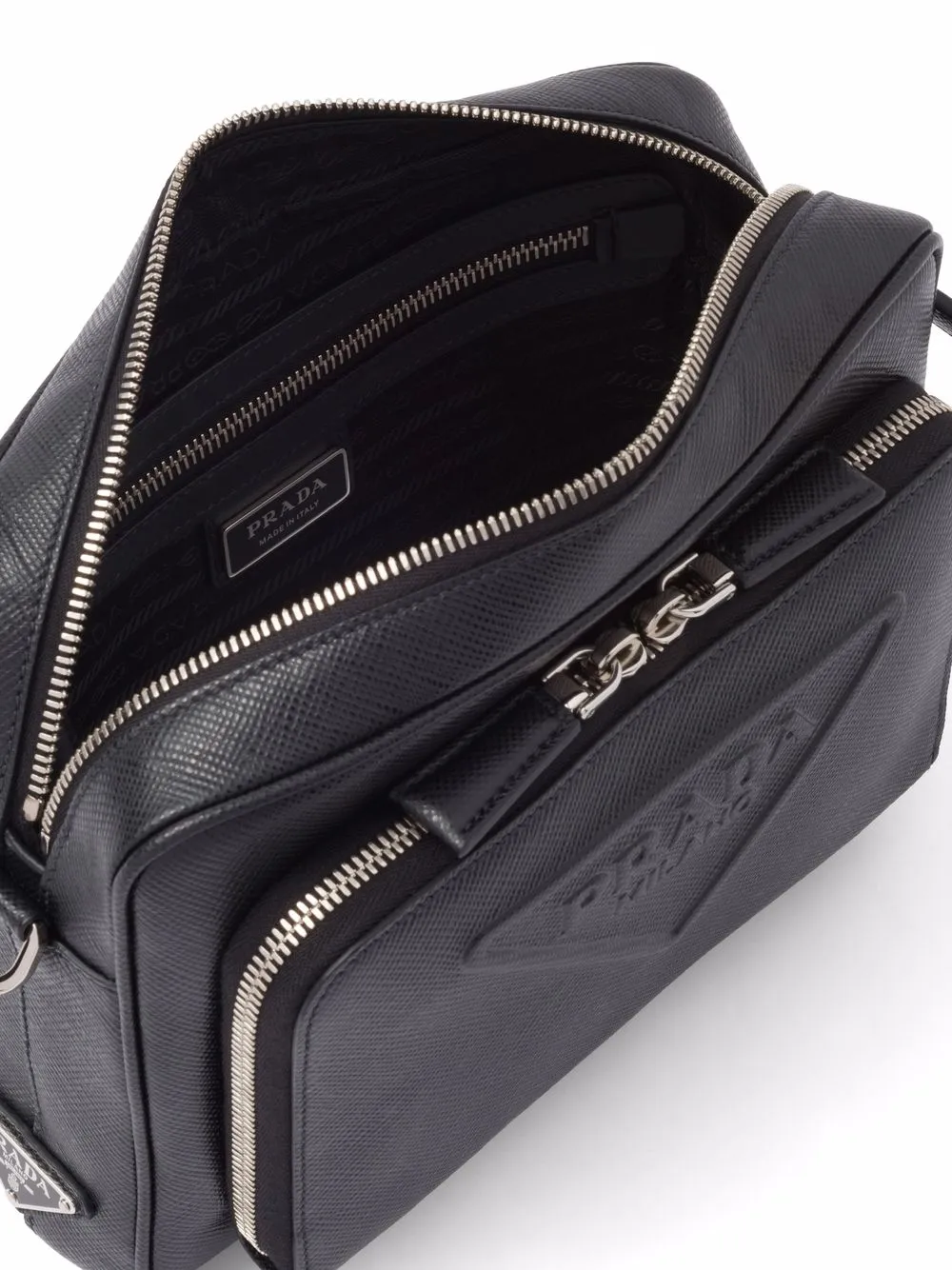 Logo en relieve en la parte delantera, logo triangular, cierre con cremallera en el tope, correa para el hombro con logo, correa ajustable y removible para el hombro, compartimento frontal con cremallera y bolsillo interno con cremallera. Material: cuero.