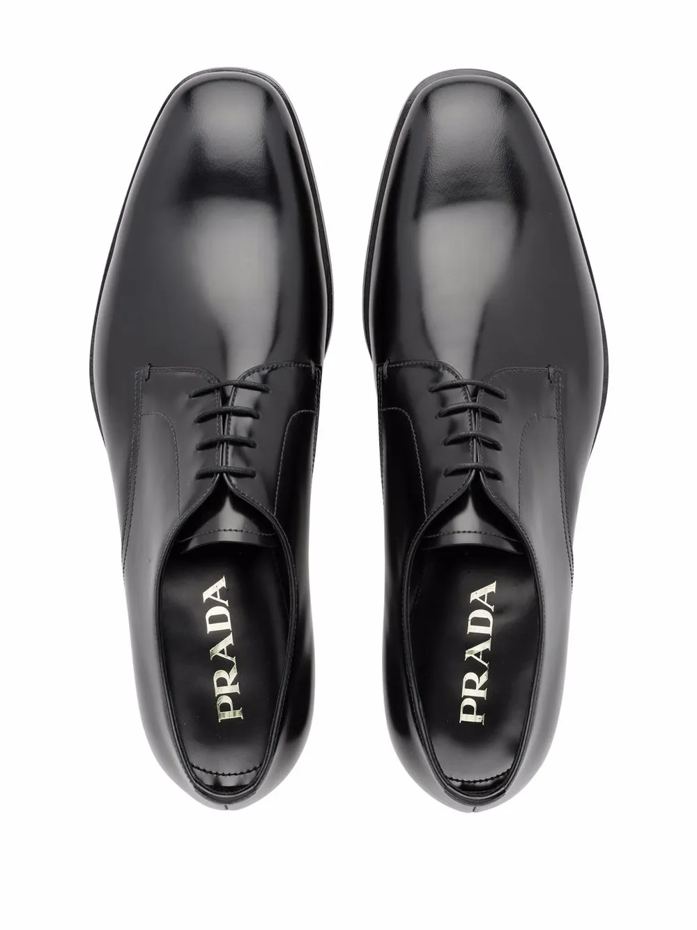Puntera de almendra, cierre con cordones en la parte delantera, plantilla con logo y tacón cuadrado bajo. Material: cuero.
