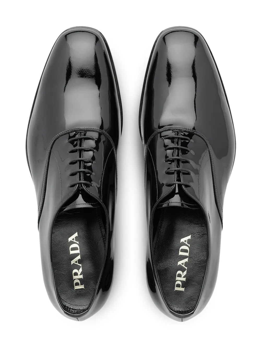 Zapatos Oxford de charol en cuero y charol de color negro de Prada con puntera de almendra, cierre con cordones en la parte delantera, plantilla con logo, plantilla de cuero y suela de cuero.