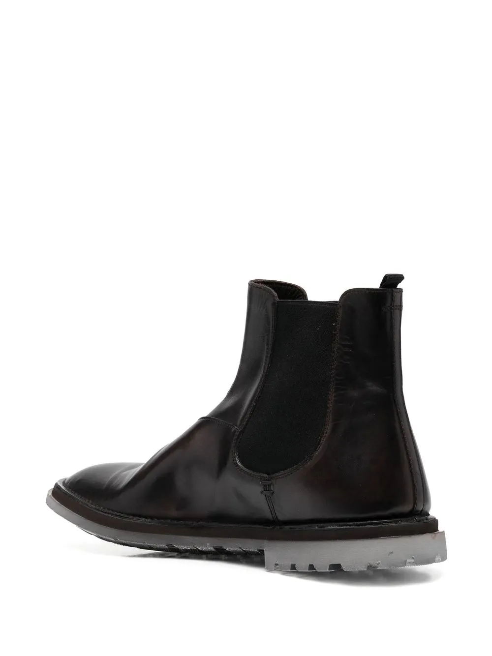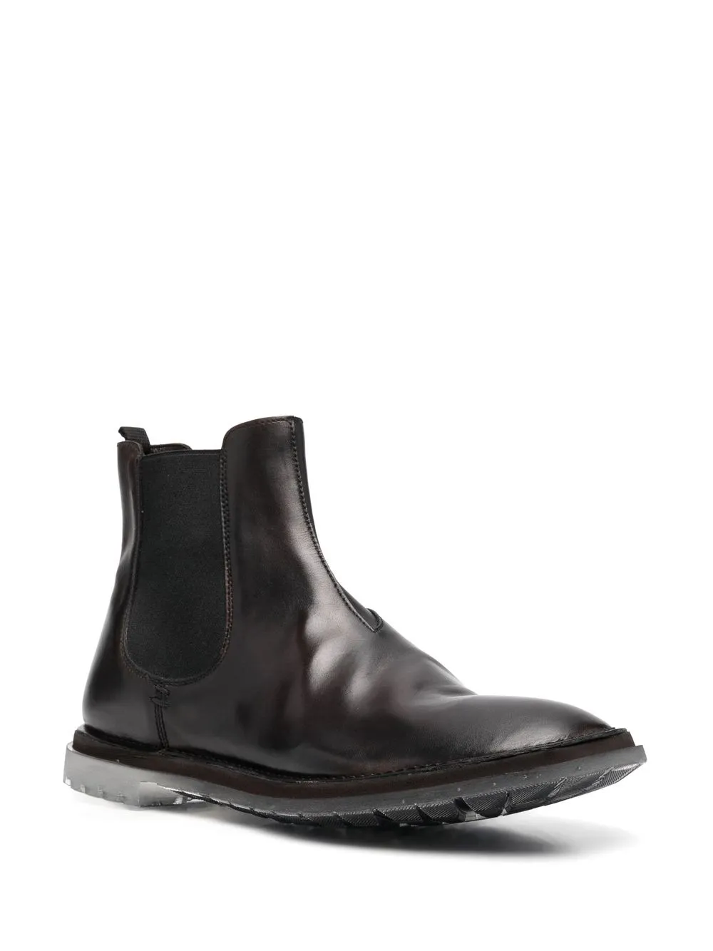 Marrón café, piel de becerro, cuero, paneles laterales elásticos, estilo slip-on, puntera de almendra, suela dentada de goma y tacón bajo.