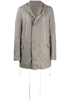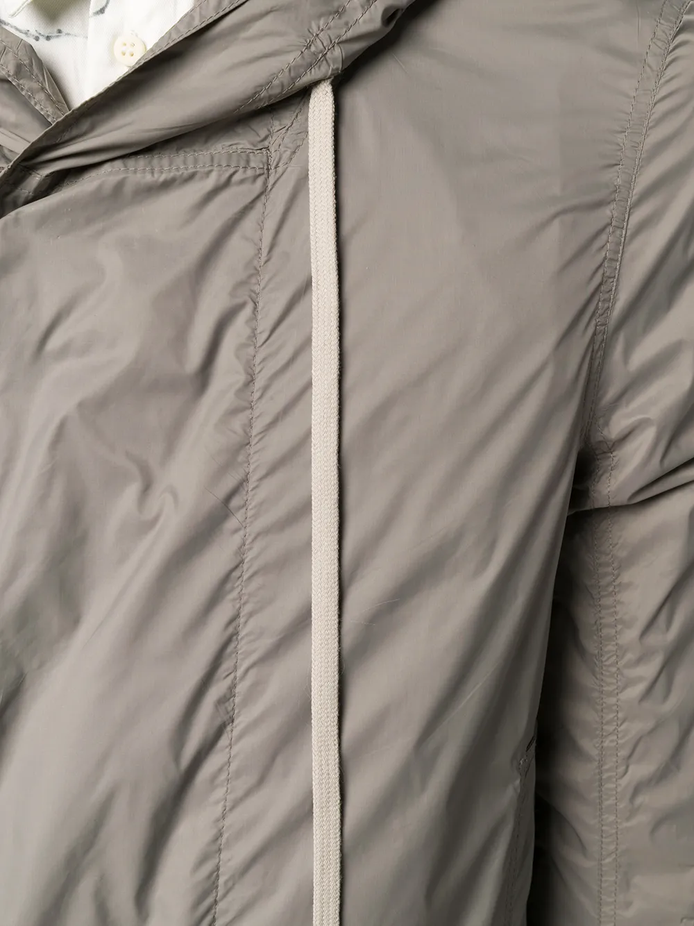 Chubasquero midi con capucha de color gris de Rick Owens DRKSHDW con capucha con cordones, cierre con cremallera y botones ocultos en el frente, manga larga, bolsillos con solapa laterales y dobladillo con cordón.