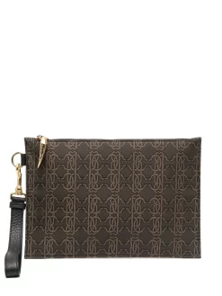 Marrón, efecto texturizado, motivo de monograma, compartimento principal, cierre con cremallera en el tope, tira para la muñeca y detalle de charm.