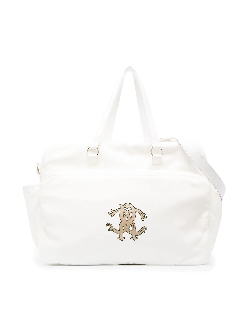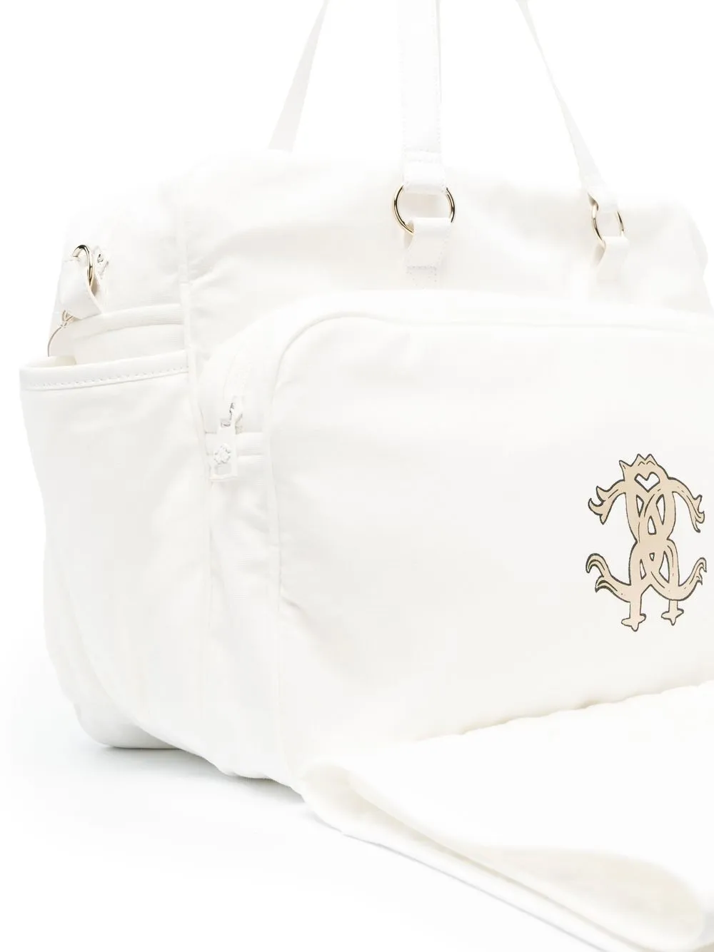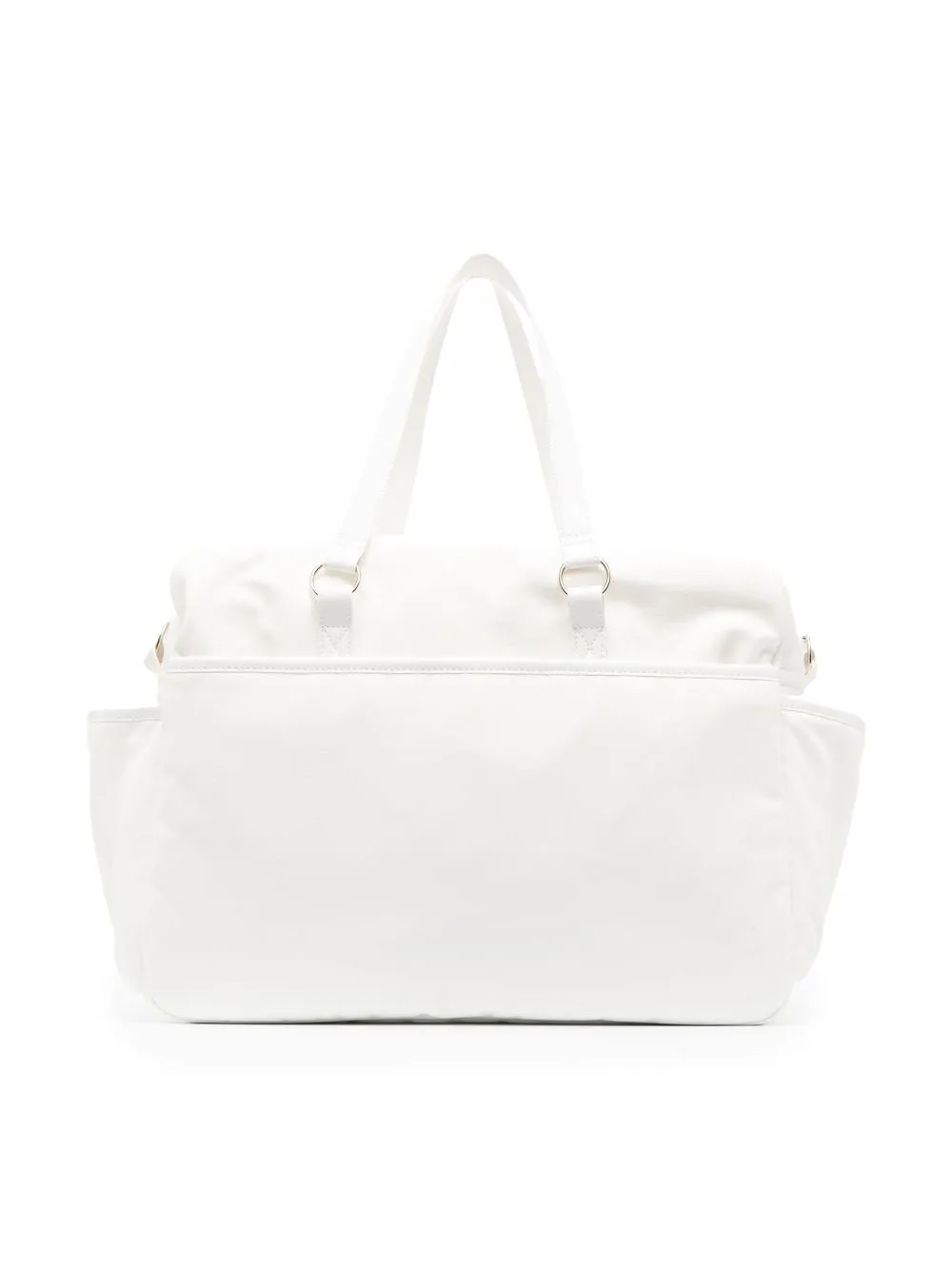Blanco, algodón stretch, estampado del monograma, cierre con cremallera en el tope, compartimento principal, múltiples bolsillos internos, dos bolsillos de parche laterales, bolsillo con cremallera en la parte delantera, dos asas planas en la parte superior y cambiador.
