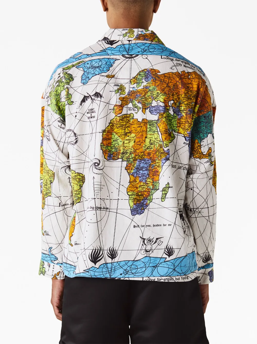 World Map notched-collar shirt from SAINT MXXXXXX featuring white, multicolour, cotton-silk blend, all-over graphic print, notched collar, front button fastening, long sleeves and straight hem.