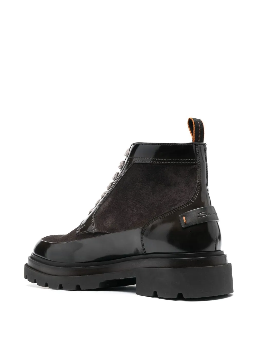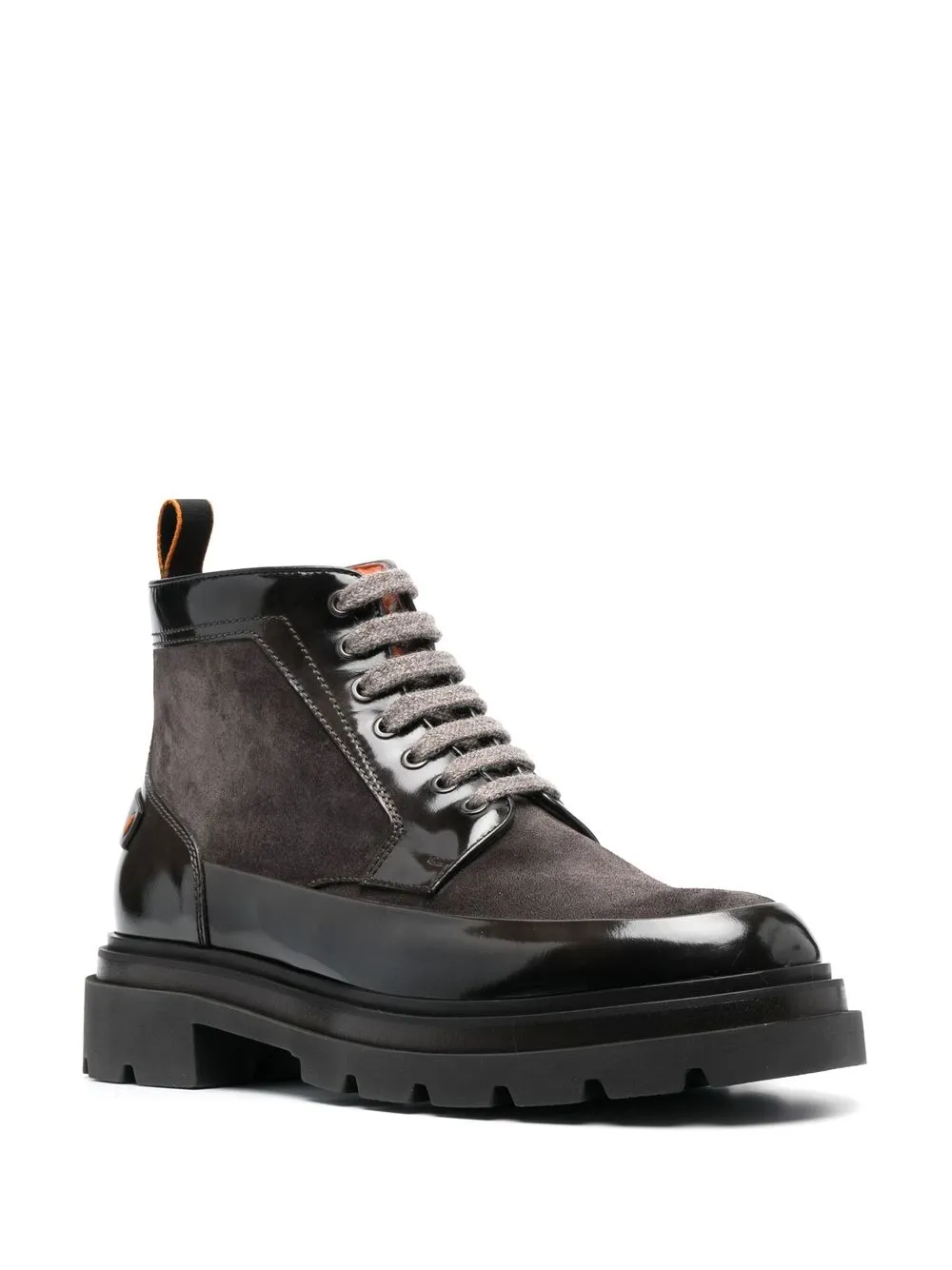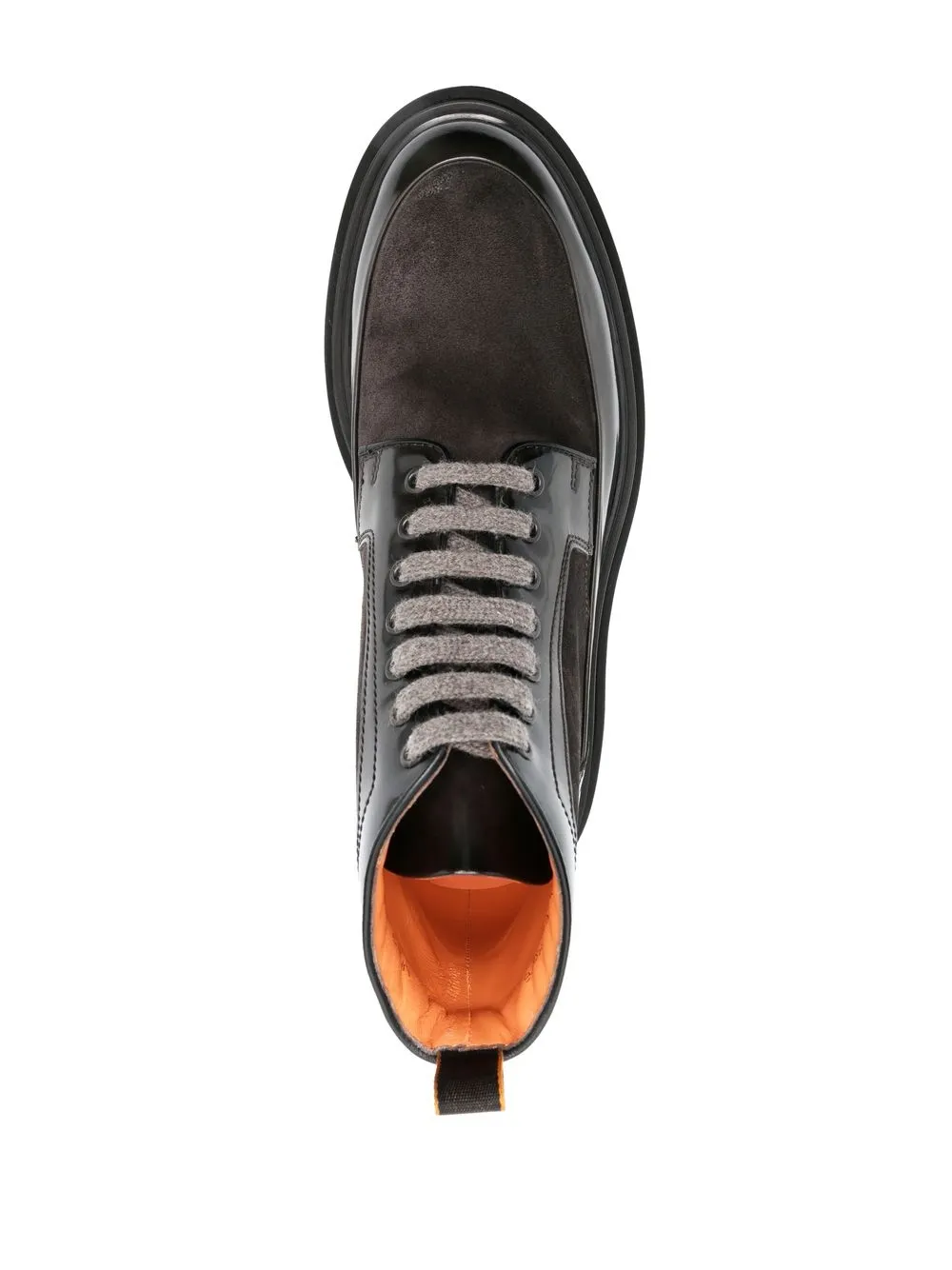 Gris oscuro, piel de becerro, ante de becerro, acabado de charol, diseño de paneles, logo grabado, puntera redonda, cierre con cordones en la parte delantera, lengüeta en la parte posterior y suela dentada de goma.