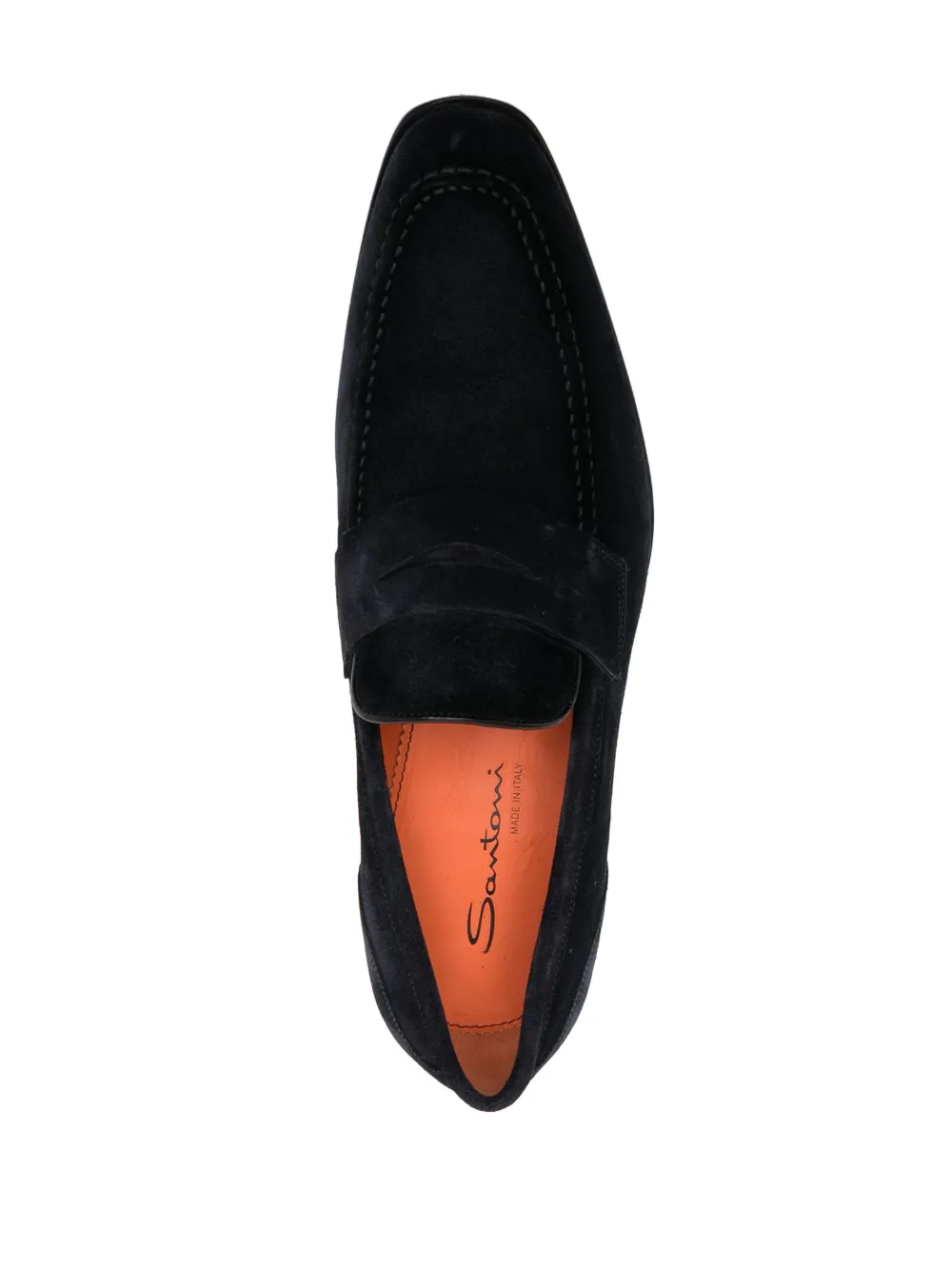 Azul marino, ante de becerro, puntera de almendra, detalle penny, plantilla con logo y suela plana de goma.