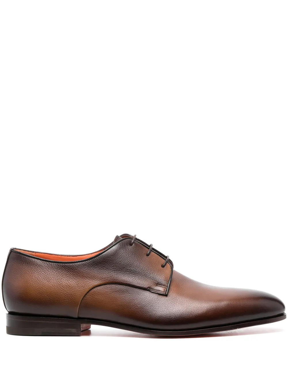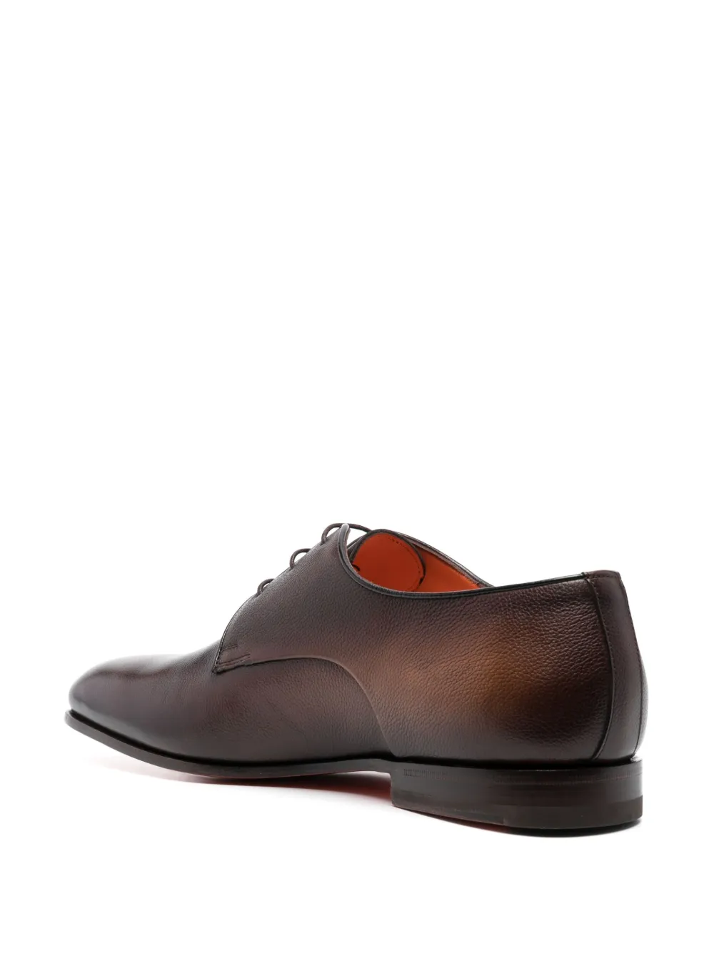 Marrón coñac, piel de becerro, acabado texturizado, efecto degradado, puntera de almendra, cierre con cordones en la parte delantera, plantilla de piel con logo y tacón bajo grueso.