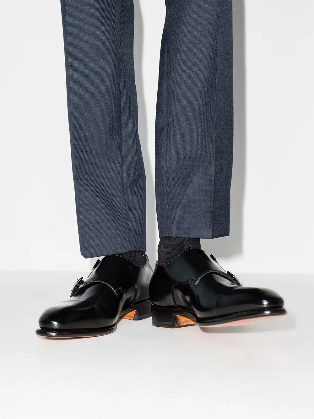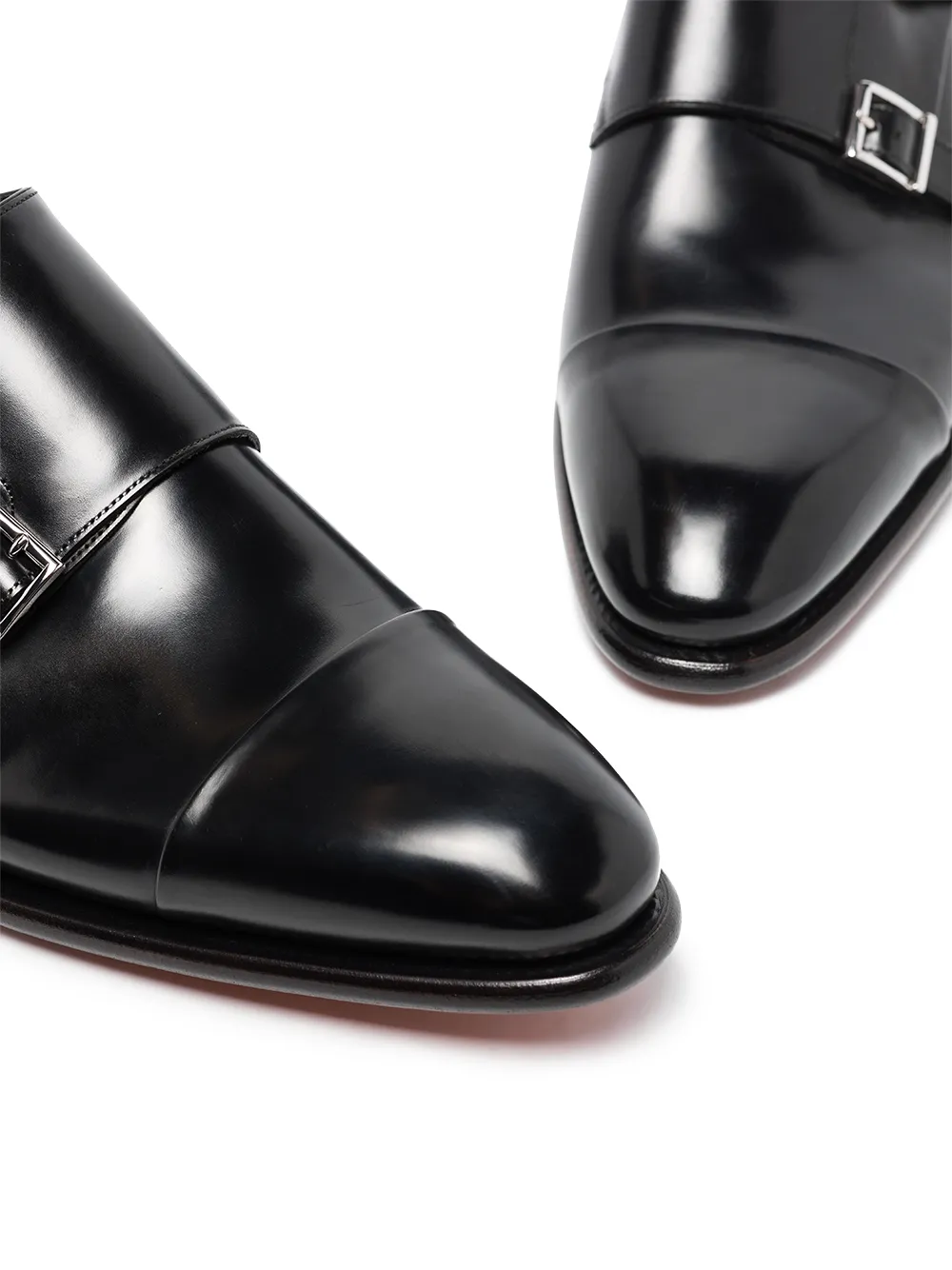 Negro, cuero, plantilla con logo, acabado en tono plateado, cierre con hebilla, suela plana de cuero y puntera de almendra.