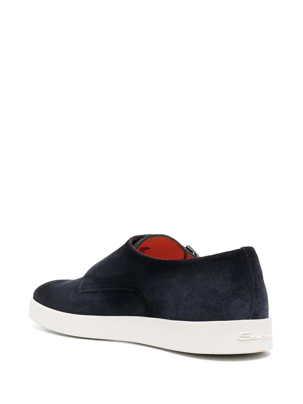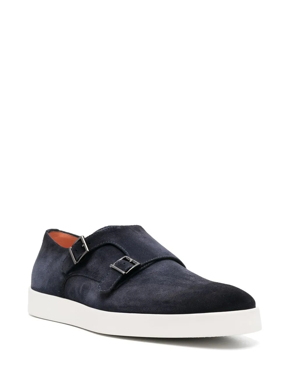 Azul marino, blanco, piel de becerro, diseño de dos tonos, puntera redonda, cierre con hebilla doble y suela plana de goma.