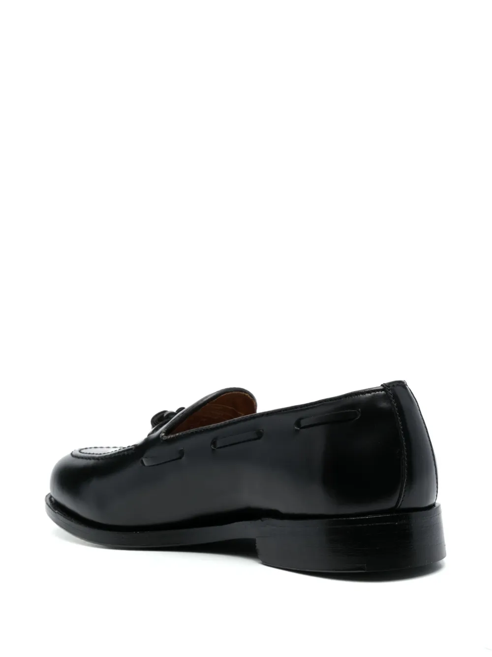 Negro, piel de becerro, detalle de borla, detalle de correa, costuras del mismo tono, puntera de almendra, plantilla de piel con logo y suela plana de cuero.