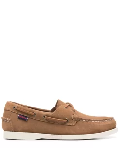 Marrón, piel de becerro, puntera redonda, costura decorativa, detalle de correa, plantilla de piel con logo y suela plana de goma.