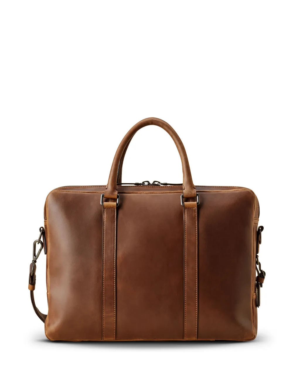 Marrón camel, cuero, logo en relieve en la parte delantera, dos asas en la parte superior, correa ajustable y removible para el hombro, cierre con cremallera en el tope, compartimento principal, bolsillo interno con cremallera y bolsillo en la parte delantera.