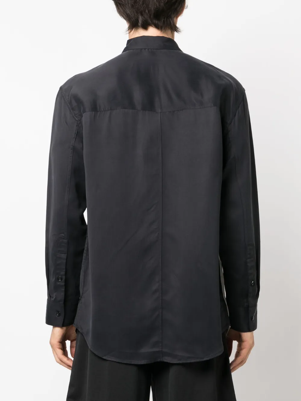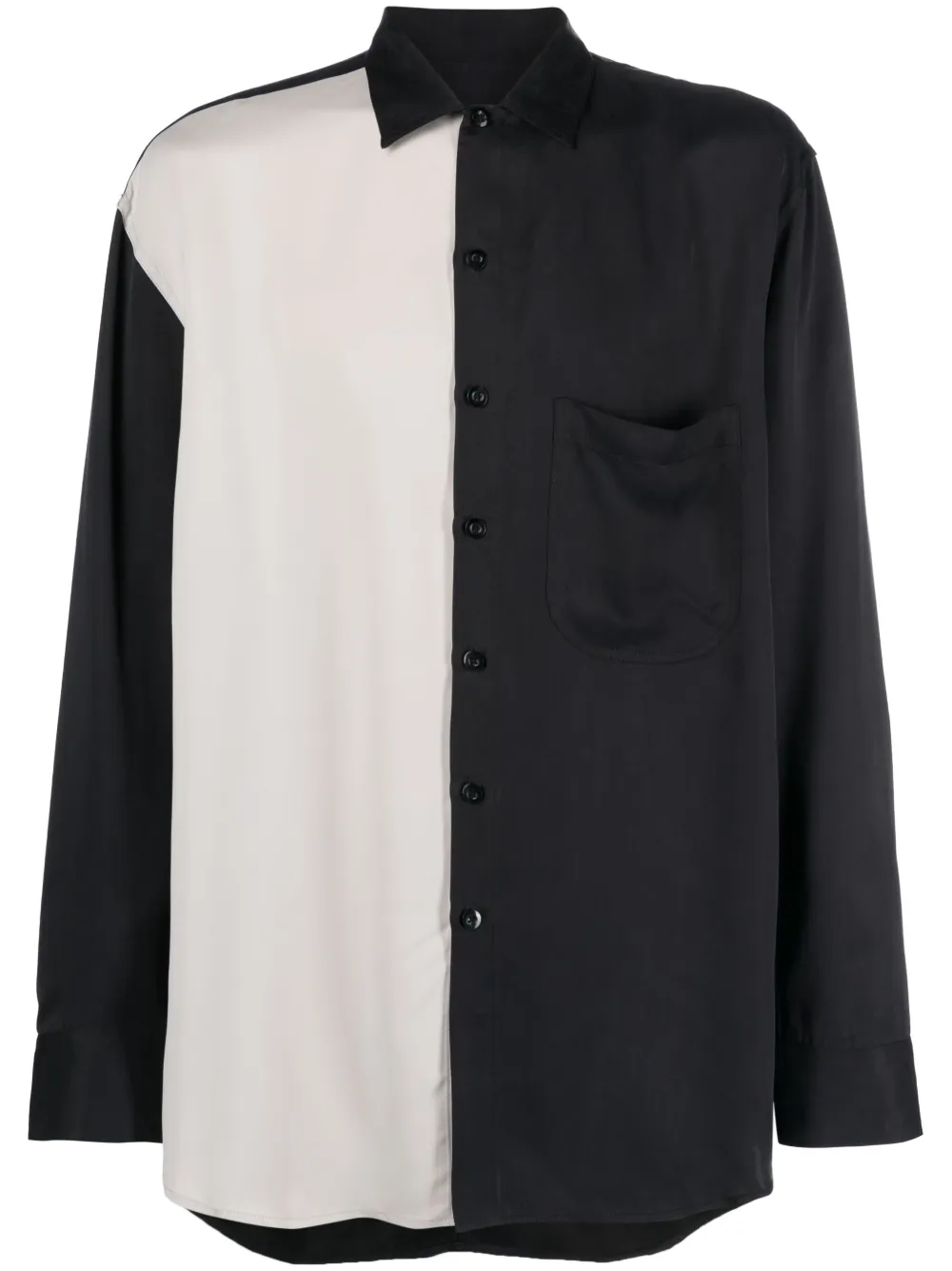 Negro y blanco, diseño de dos tonos, cuello clásico, cierre con botones en la parte delantera, manga larga, puños con botón, bolsillo de parche en el pecho y dobladillo recto.